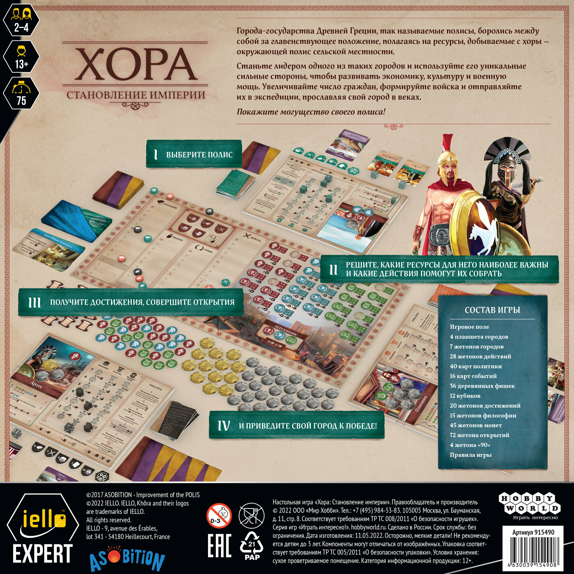 | Комплектация | Игровое поле, 4 планшета городов, 7 жетонов городов, 28 жетонов действий, 40 карт политики, 16 карт событий, 36 деревянных фишек, 12 кубиков, 20 жетонов достижений, 15 жетонов философии, 45 жетонов монет, 72 жетона открытий, 4 жетона "90", Правила игры |