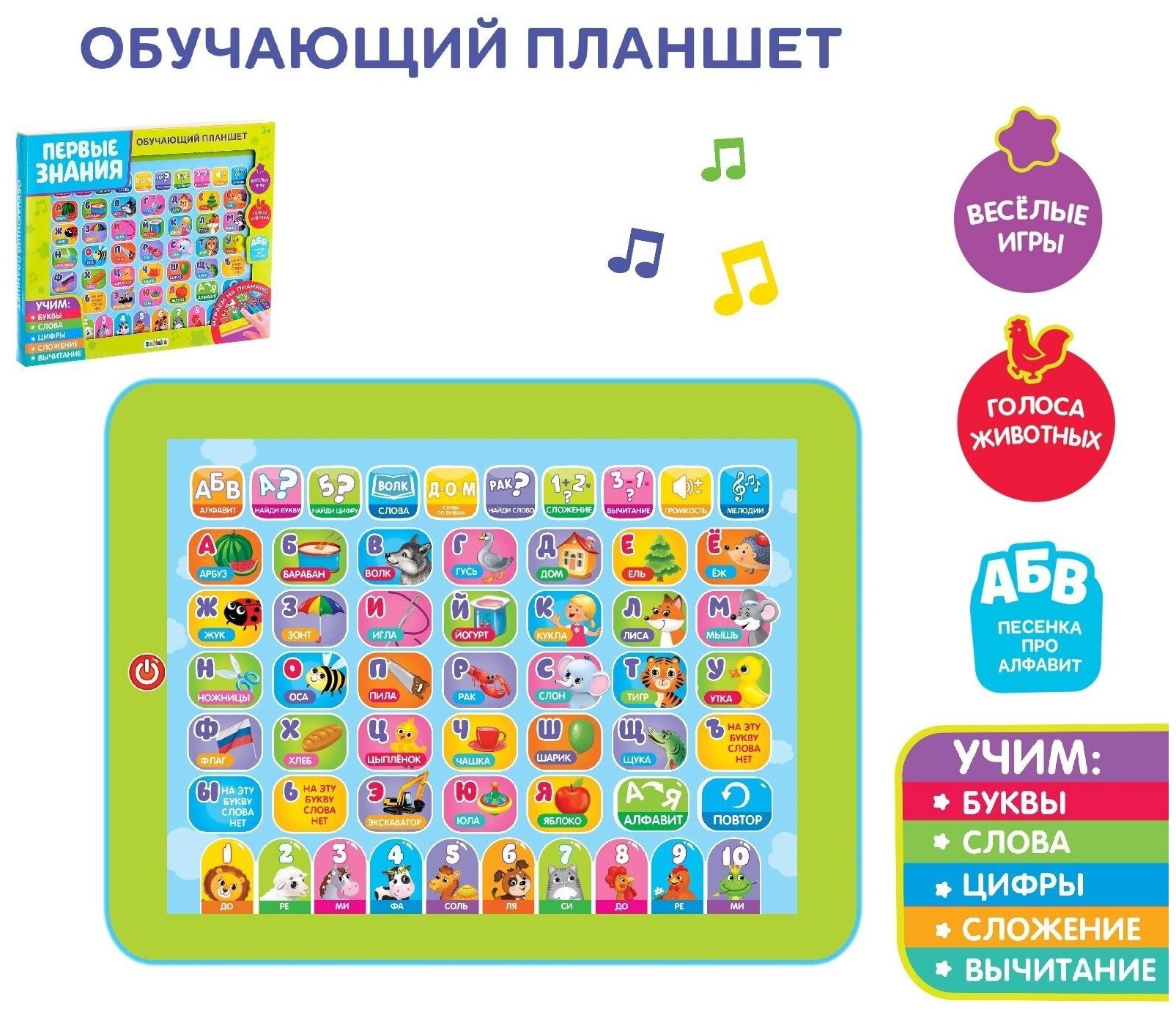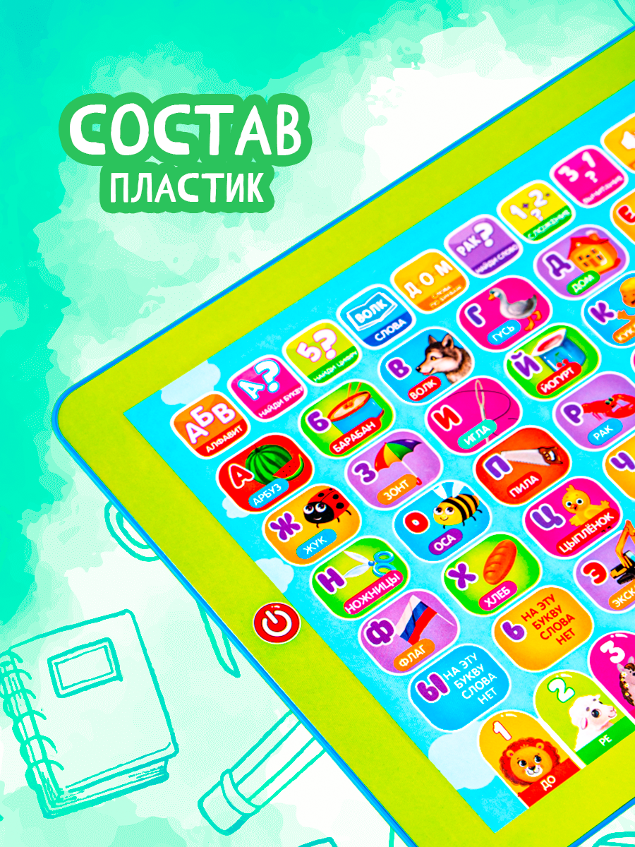 Планшет обучающий "Первые знания", изучаем алфавит, слова, цифры, сложение, вычитание, для детей и малышей от 3 лет