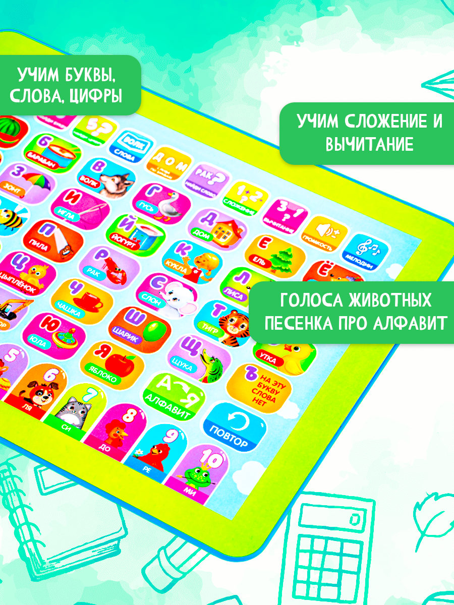 Купить Обучающий планшет для детей "Изучаем алфавит, слова, цифры, сложение, вычитание"