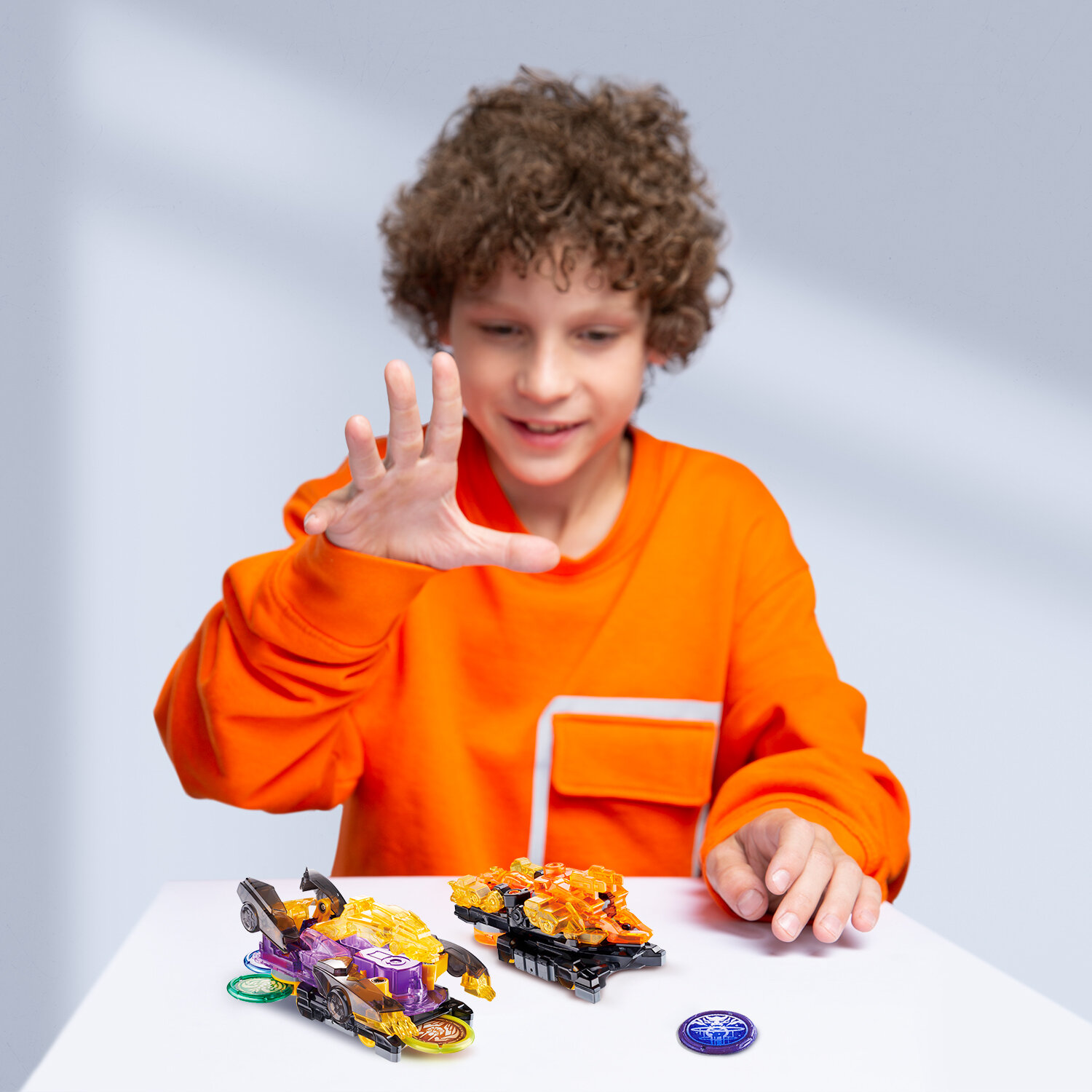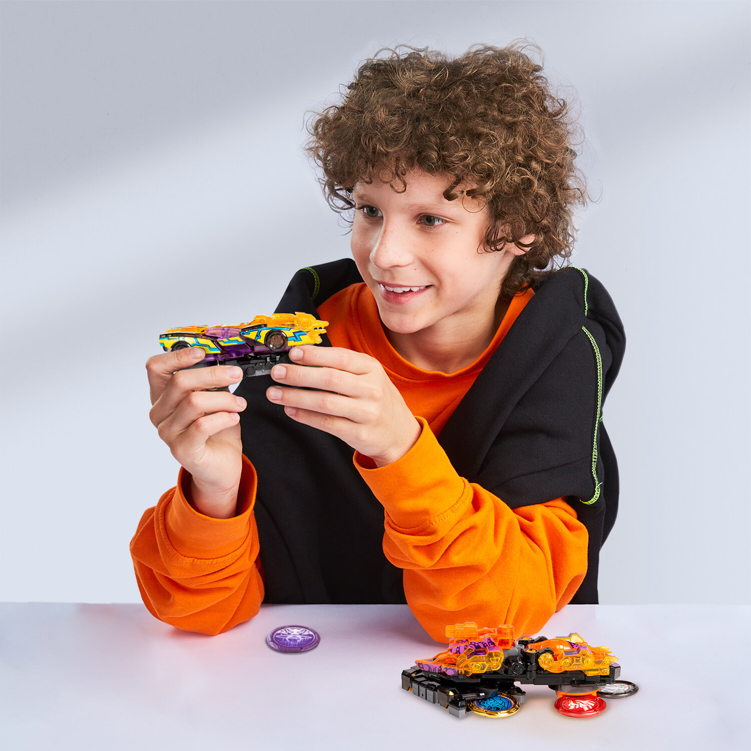 | Дополнительная информация | синхронная трансформация: одна из машинок захватывает два диска, катапультирует вторую машинку, и они одновременно трансформируются в воздухе; обратно в машинку игрушка собирается вручную; в комплекте с турбо-скричером взаимозаменяемы с машинками из 4-ой линейки |