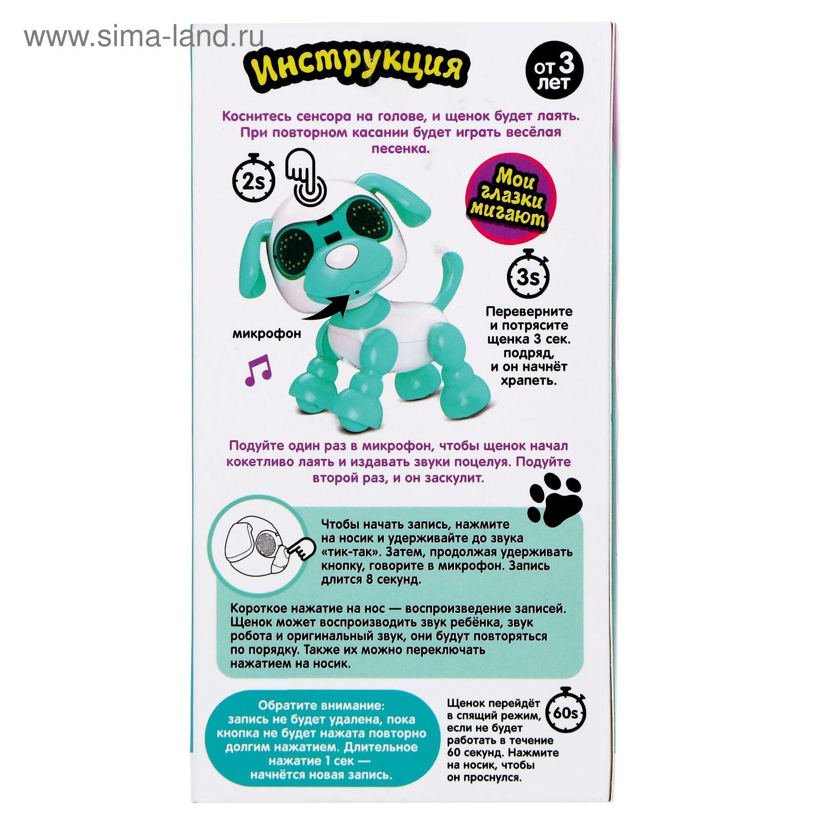 | Дополнительная информация | Лает и поёт песенку, 1 куплет. Функция записи голоса. Можно катать, игрушка без механизма движения. |