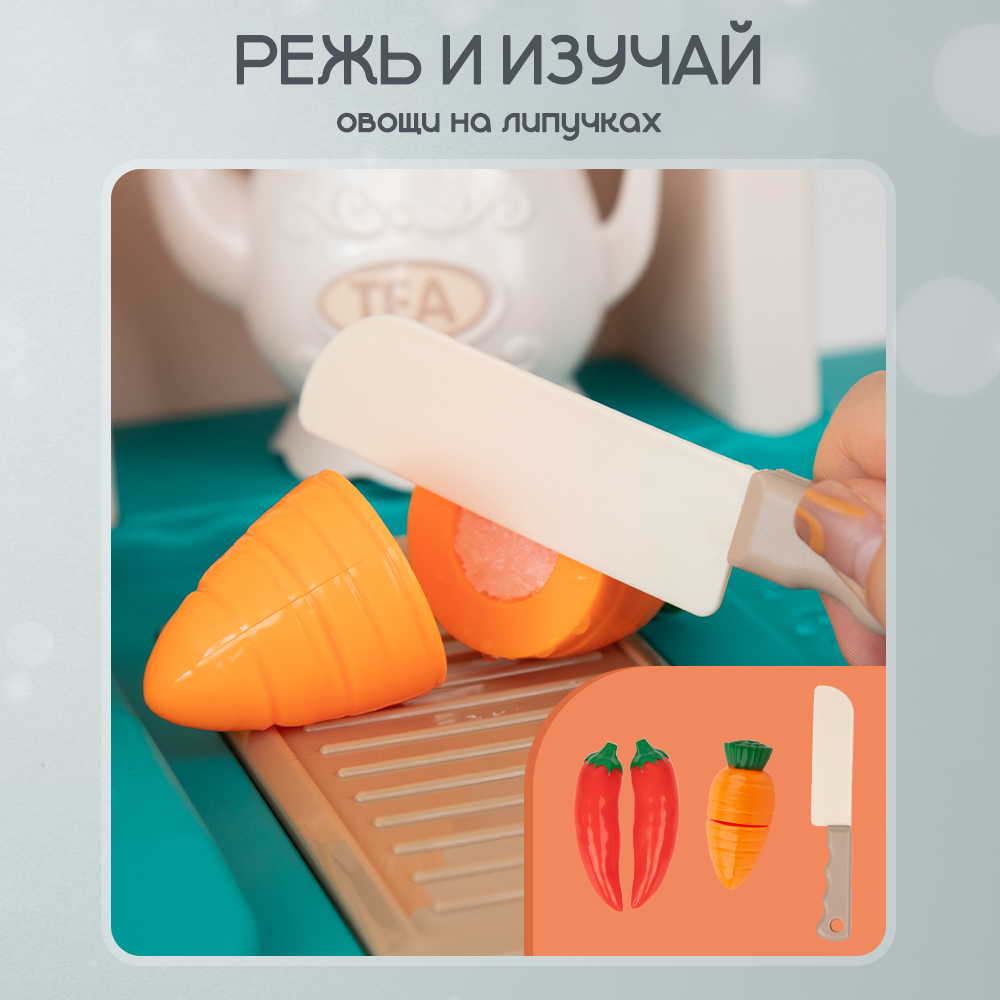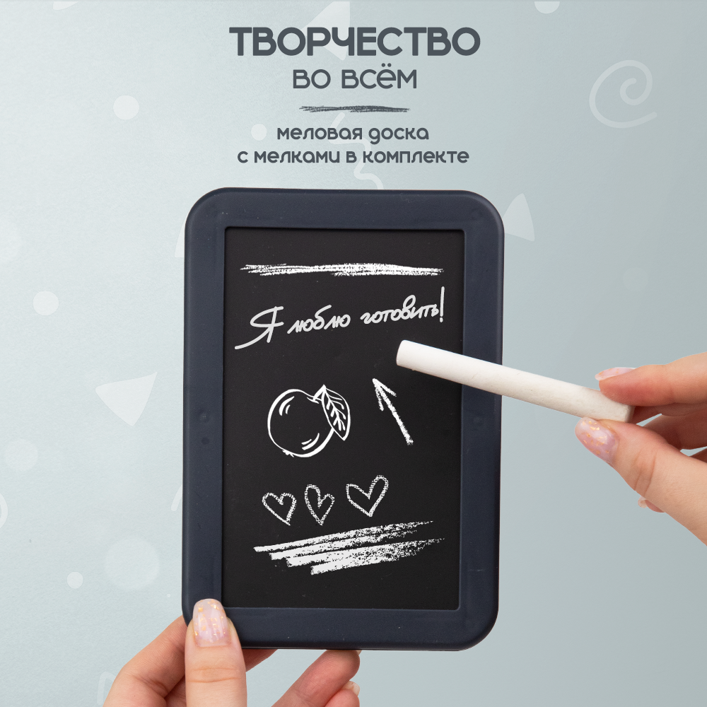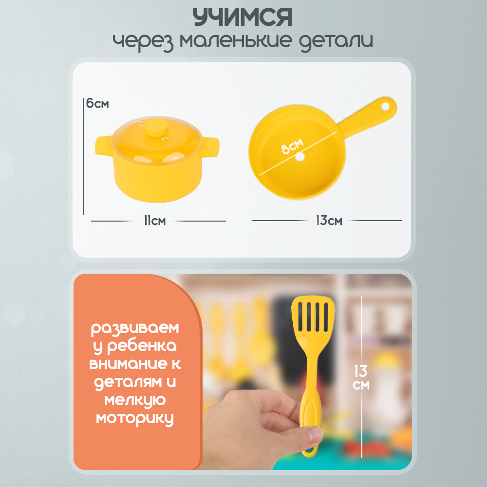 | Комплектация | сковорода / кастрюля / крышка / столовые приборы / тарелки и салатница / чайный сервиз / бутылочки и баночки для специй и приправ. Набор продуктов - конфеты и печенье / яички / готовые блюда (сосиски и яичница) / обычные овощи и фрукты / разрезные продукты. Яйцеварка / разделочная доска / меловая доска / губка и мелки / контейнеры для фруктов и овощей |