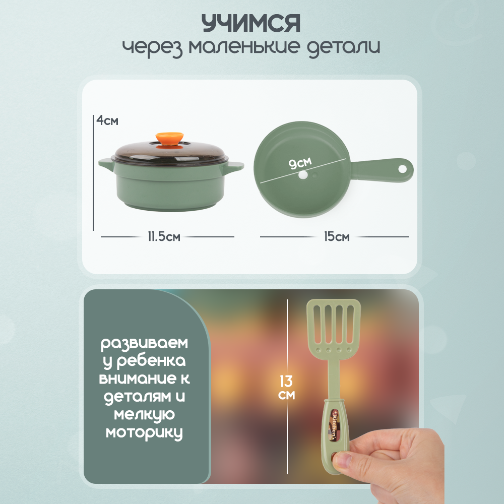 | Комплектация | 43 аксессуара: кастрюля с крышкой диаметром 9 см / сковорода диаметром 9 см / 2 тарелки диаметром 8 см / миска 7х7х3см / стакан 5х5х7см / 4 бутылочки: перец / молоко / кетчуп / соус; 2 коробки из картона / сахарница с крышкой 4.5х5 см и ложечкой 6.5 см / перечница 4х4х5.5 см / 8 приборов 10-13 см / 13 продуктов питания 5-8 см / кашпо подвесное / доска для записей 10х15 см / губка / 2 мелка |