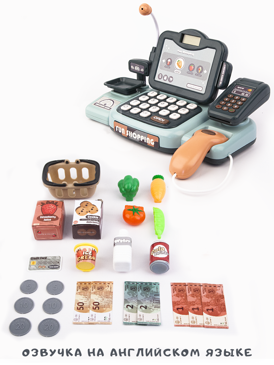 | В комплекте | банковская карта, деньги, кассовый аппарат, корзина, продукты |