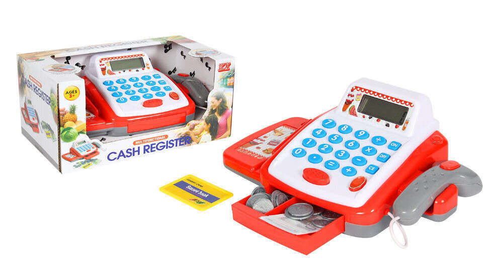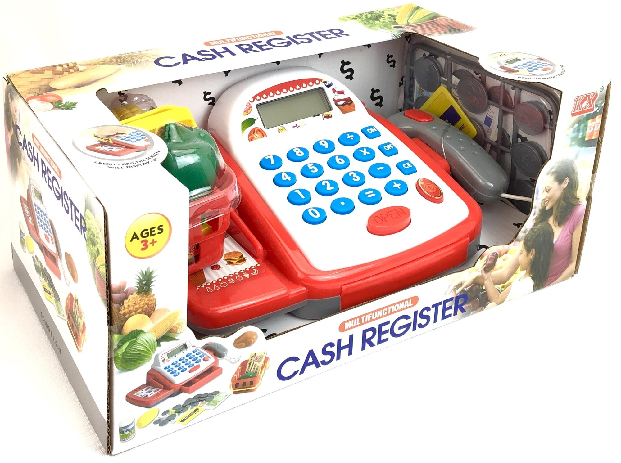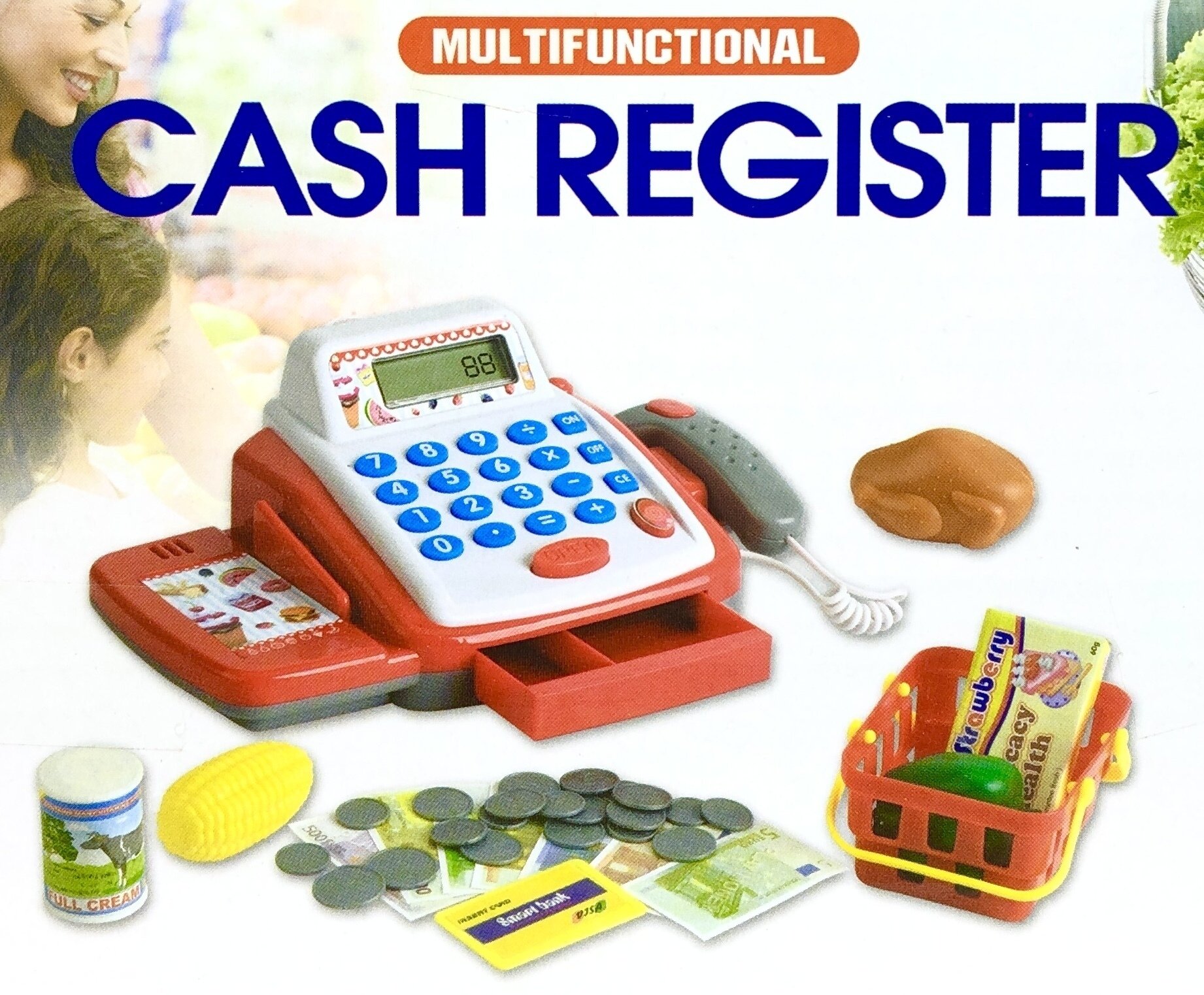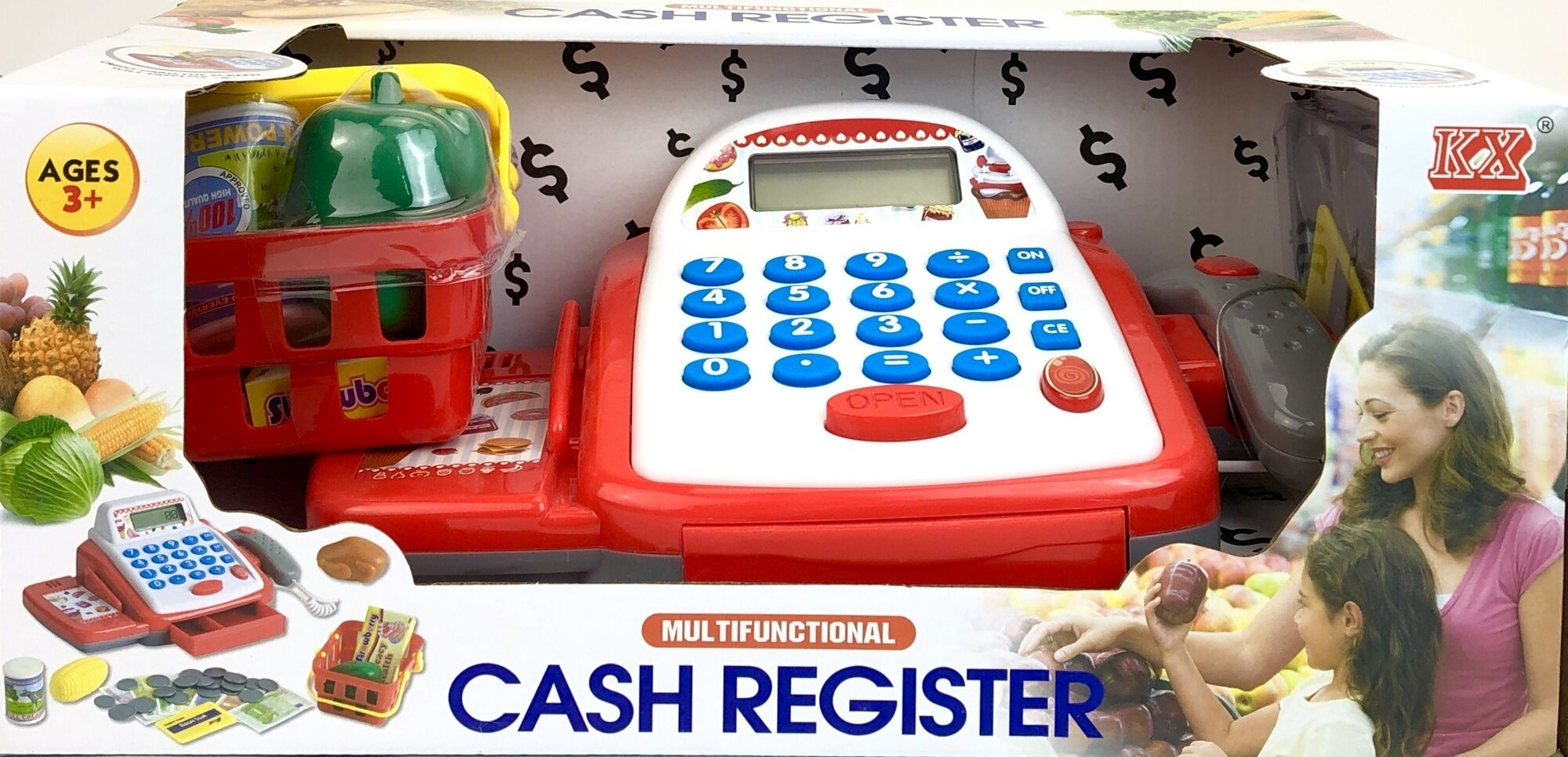 Купить Игровой набор Кассовый аппарат со сканером, корзинка с продуктами, касса, монеты, купюры, банковская карта, открывается денежный ящик, калькулятор, з