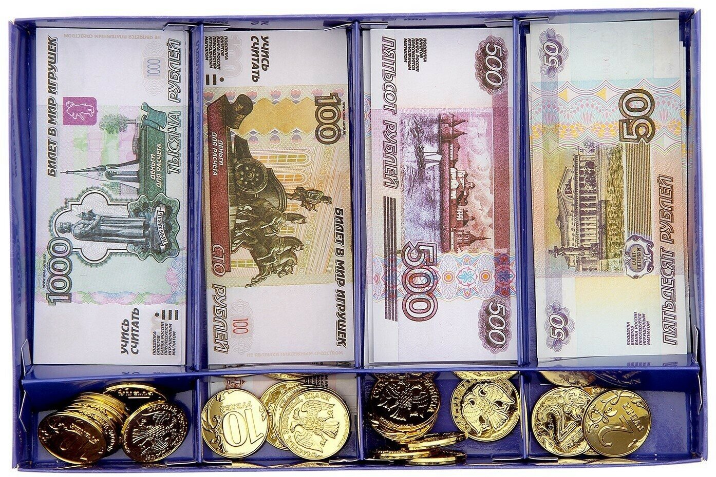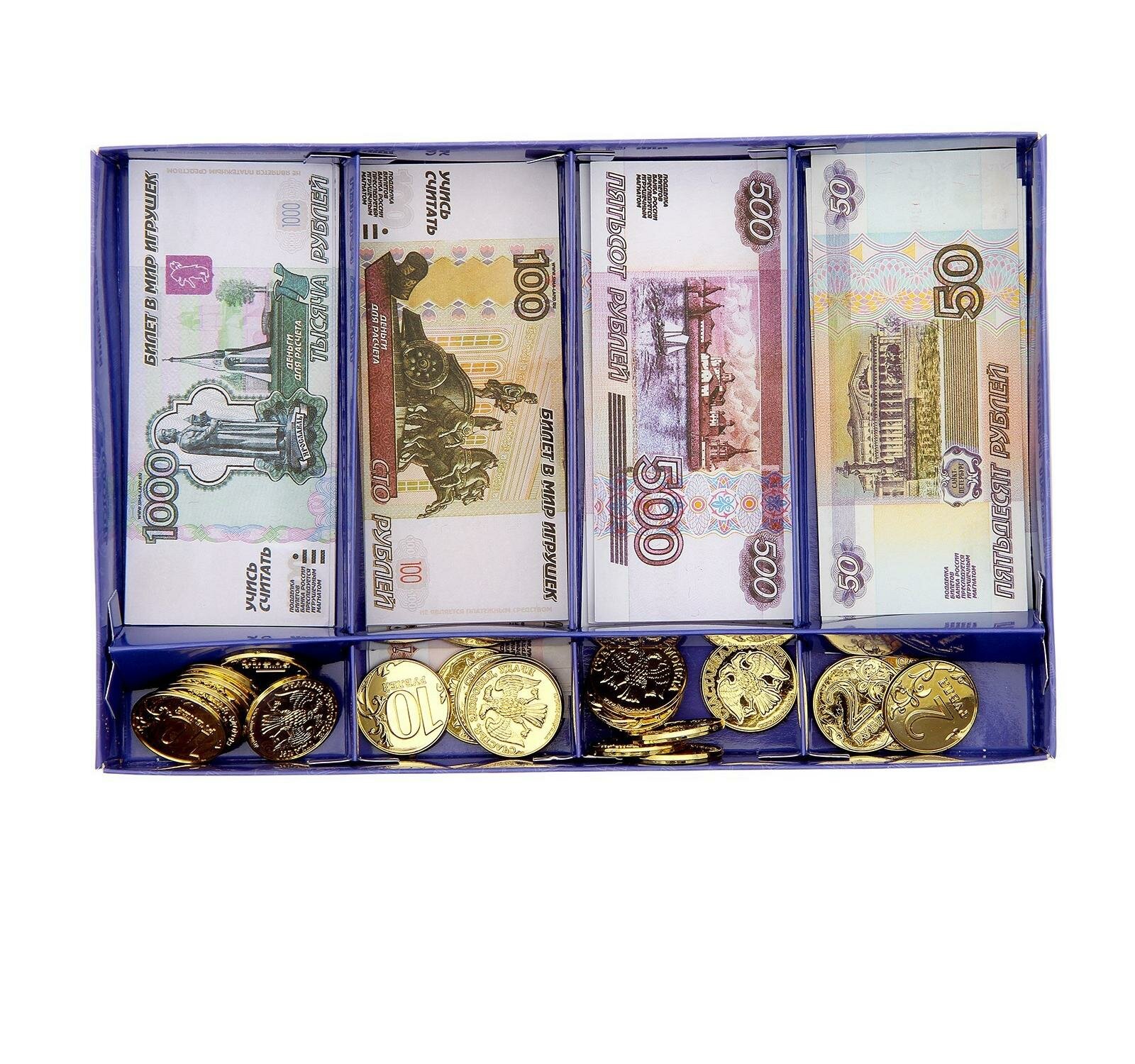 | Комплектация | 5000 рублей — 6 купюр / 1000 рублей — 9 купюр / 500 рублей — 9 купюр / 100 рублей — 18 купюр / 50 рублей —28 купюр,10 рублей / монета — 4 шт., 5 рублей / монета — 4 шт. / 2 рубля / монета — 4 шт. / 1 рубль / монета — 4 шт. |