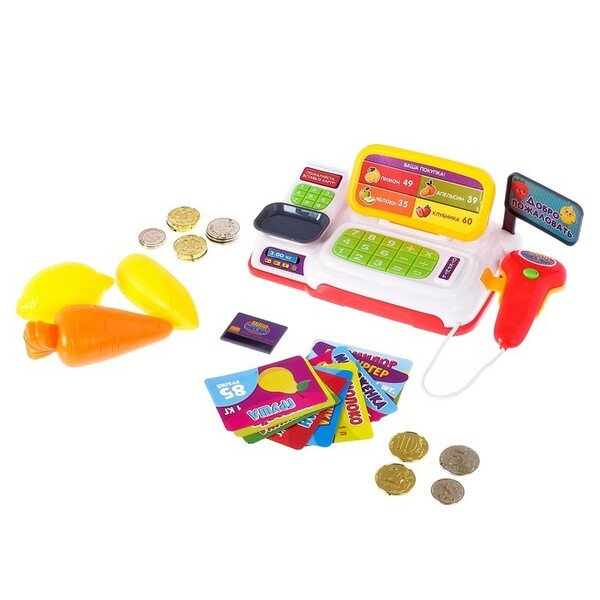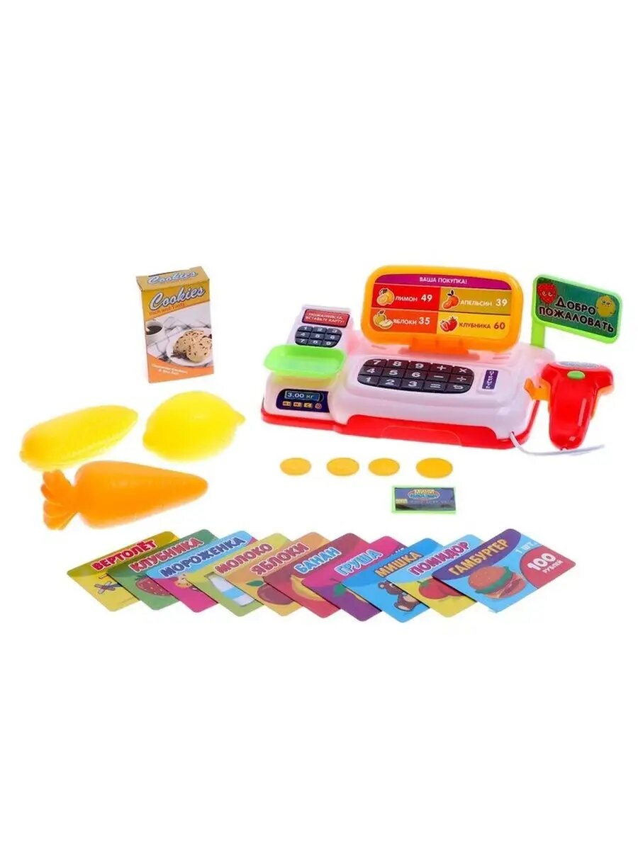 | Комплектация | кассовый аппарат / 4 вида монет по 4 шт. / 10 ценников / банковская карта / продукты |