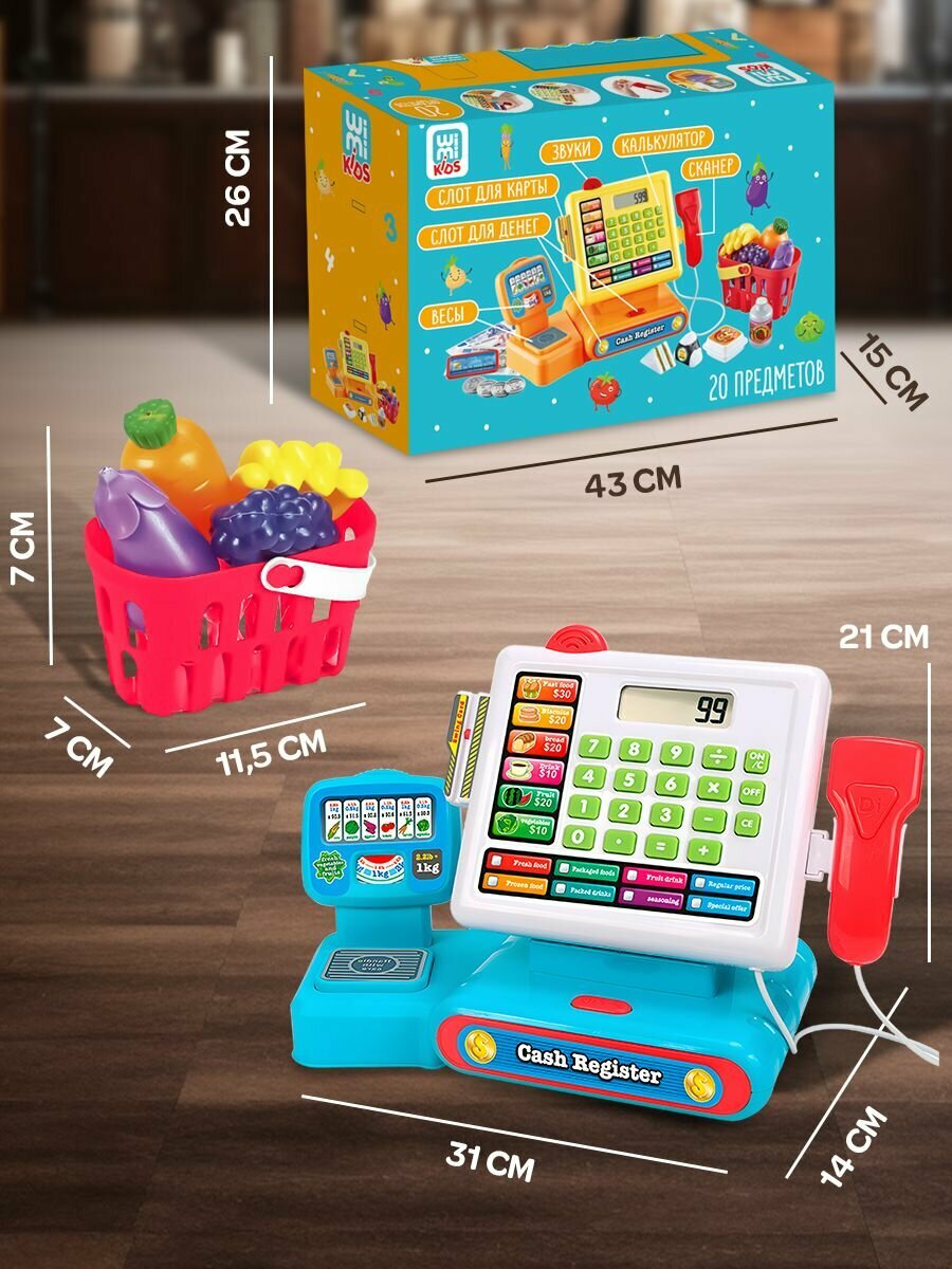 | Комплектация | Детская игрушечная касса; деньги игровые; корзинка с продуктами |