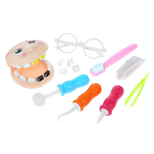 | Комплектация | имитация челюсти, 4 дополнительных зуба, 3 инструмента стоматолога (зеркало, зубной зонд, бормашина), тюбик, щетка, щипцы, очки |