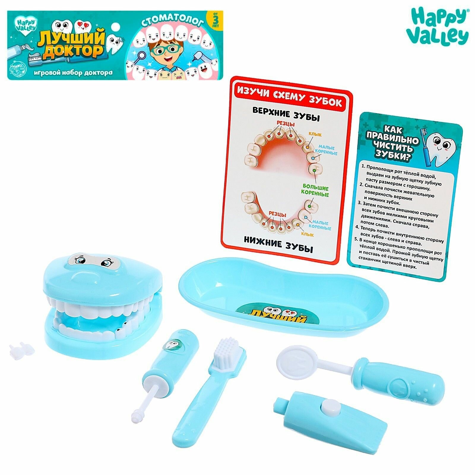 | Комплектация | зеркало; зонд; кюрет; шприц; щипцы; лоток для инструментов; челюсть; схема зубов; рекомендации по чистке |