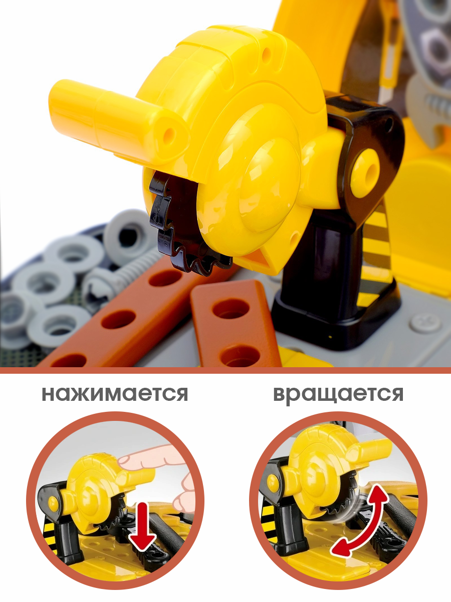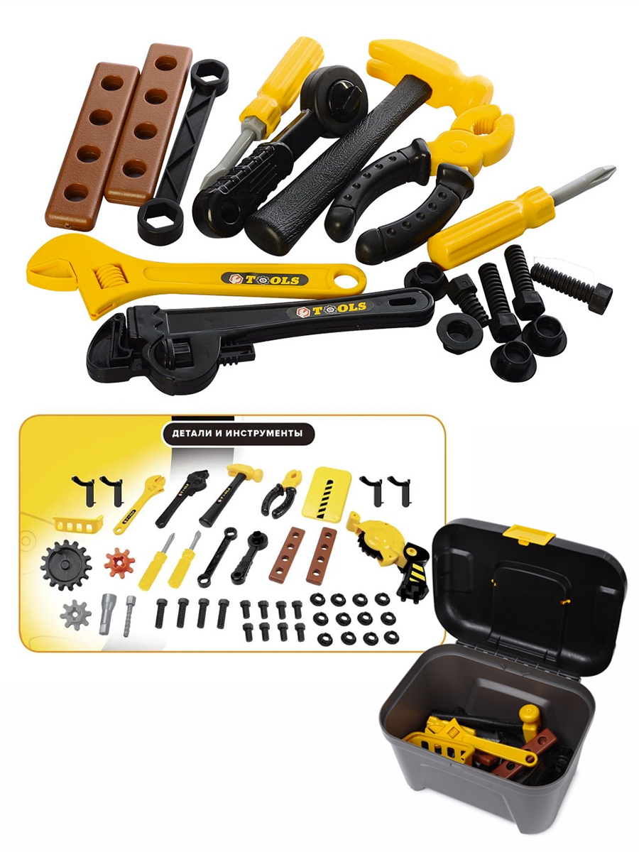 | Комплектация | чемодан (18х28х22см), 1 разводной ключ, 1 струбцина, 1 молоточек, 1 плоскогубцы, 1 уровень, 3 шестерёнки, 1 крестовая отвёртка, 1 плоская отвёртка, 2 насадки, 2 гаечных ключа, 1 циркулярная пила, 2 прямоугольные детали, имитирующие древесину, 12 болтов, 12 гаек, 4 крючка, 1 полочка. Размер инструментов в среднем 18х8см |