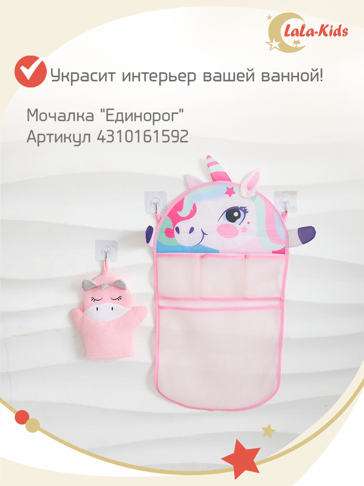 Сетка для игрушек в вaнную и мочалка "Единорог" LaLa-Kids розовая