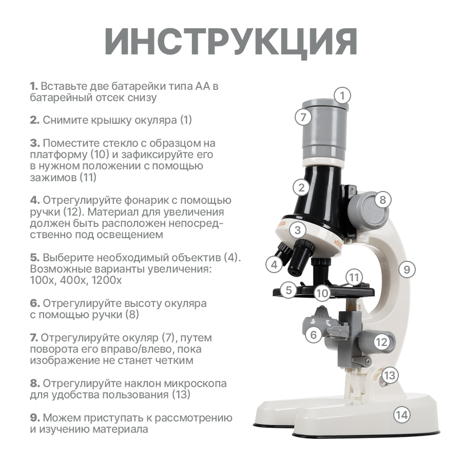 | Комплектация | Батарейки, стекла, пробирки, контейнер, микроскоп, инструменты |