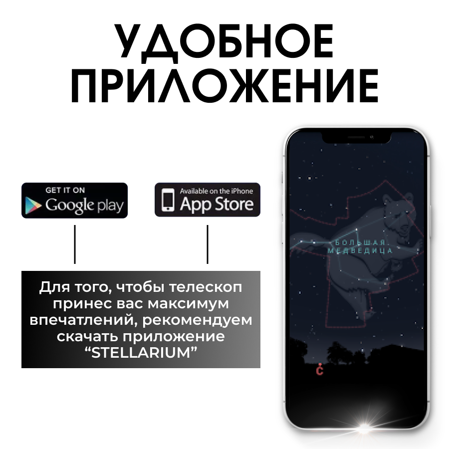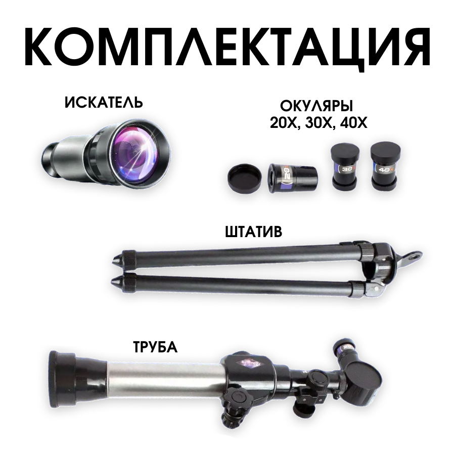 | Комплектация | Телескоп, Искатель, Штатив, окуляр 20х, 30х, 40х |