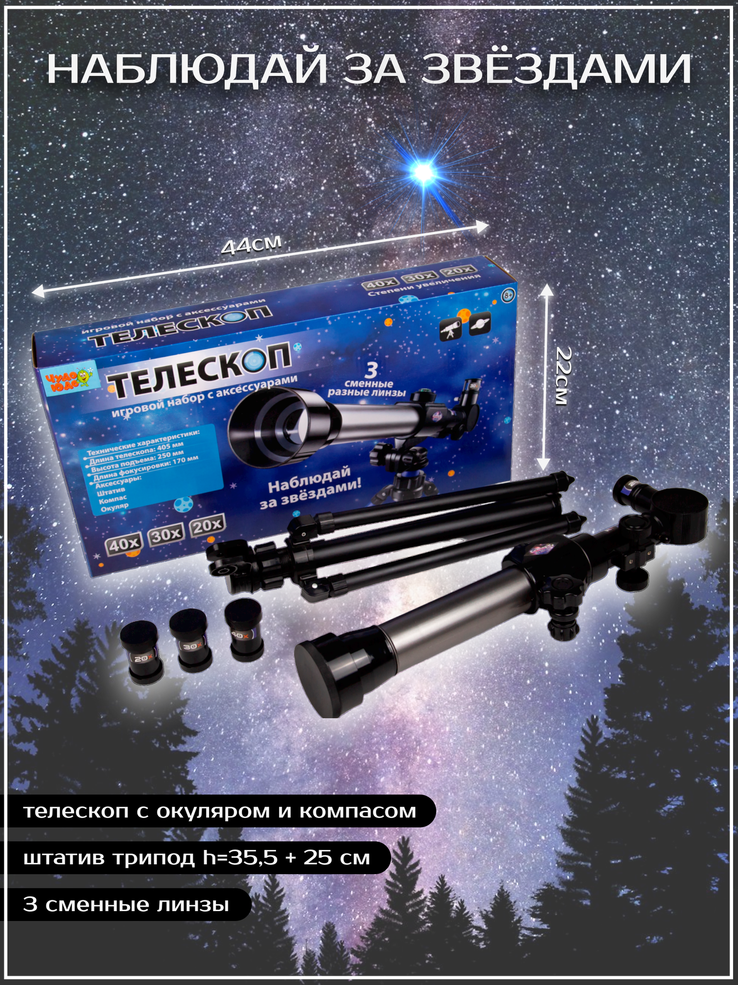 | Комплектация | телескоп с окуляром и компасом, штатив трипод, 3 сменные линзы, степени увеличения: 20х, 30х, 40х. |