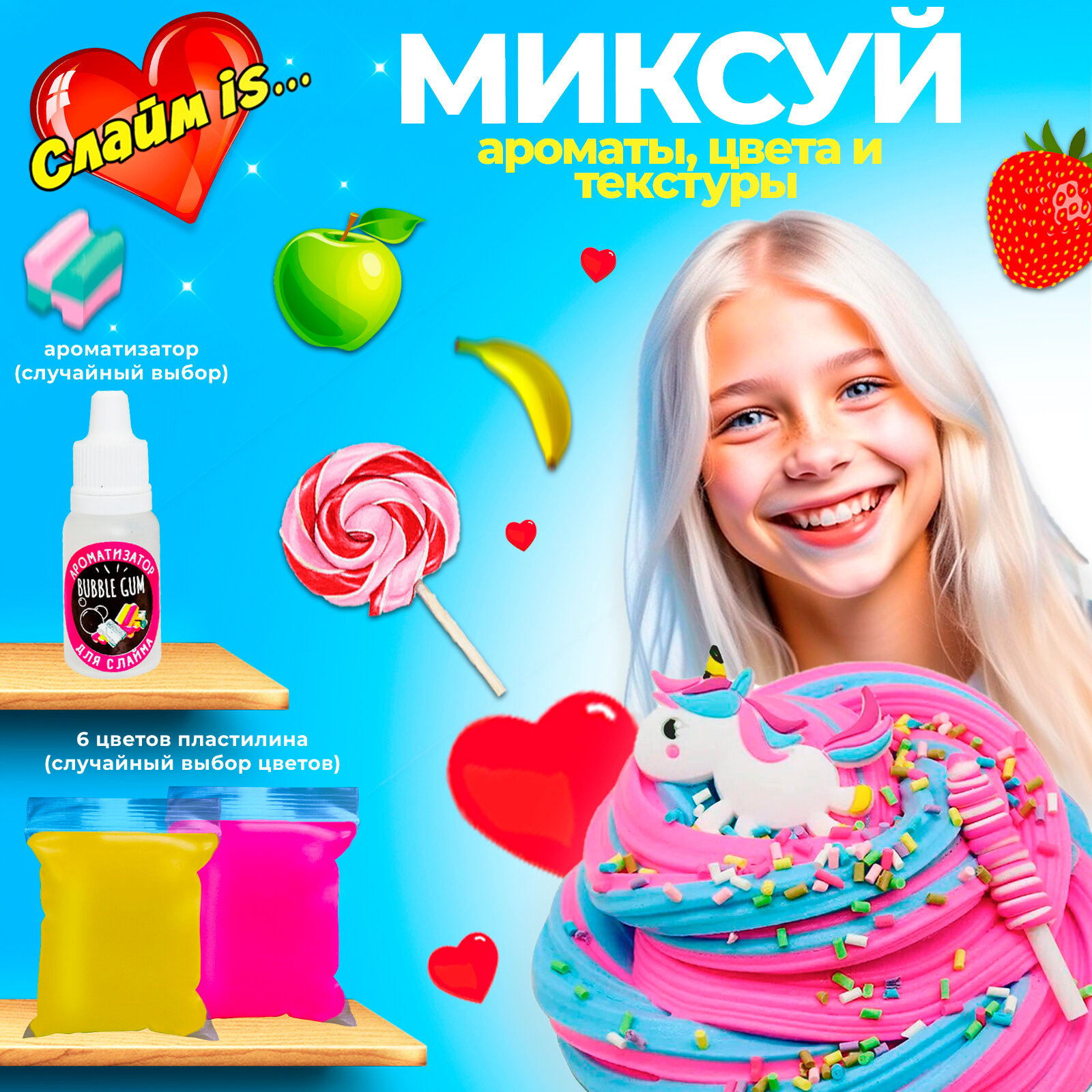 | Комплектация | основа 250 мл, загуститель 100 мл, пластилин 6 шт, посыпки 5 шт, наполнитель мелкие шарики, шармики 5 шт, ароматизатор, наклейки для баночек 9 шт, баночки 50 мл 6 шт, ложка, палочки 3 шт, стек 2 шт, перчатки 2 пары, инструкция, контейнер |