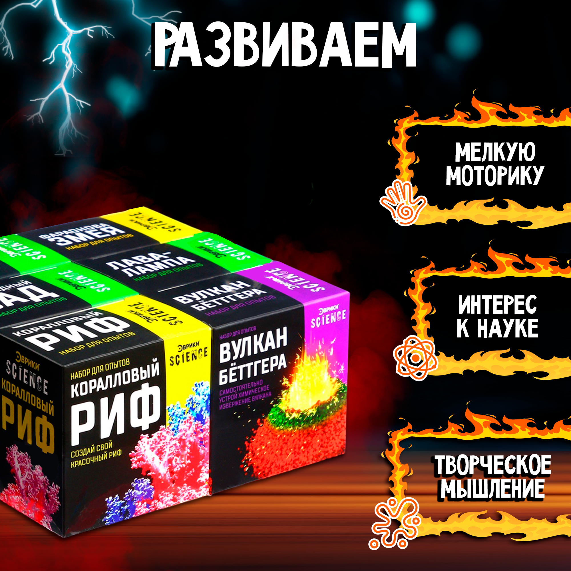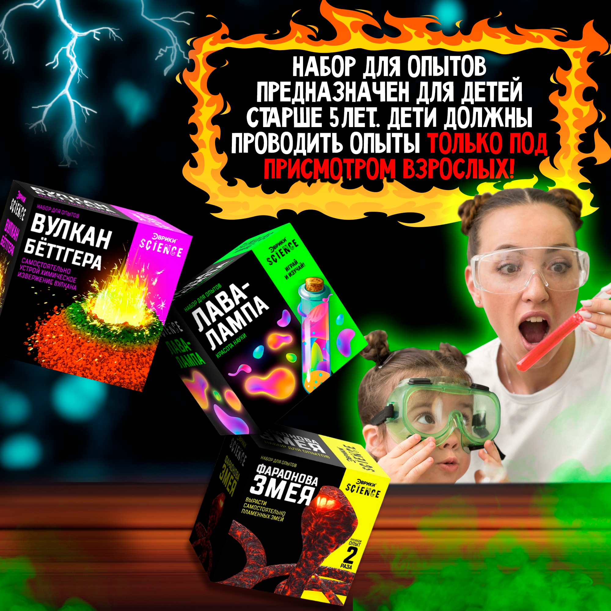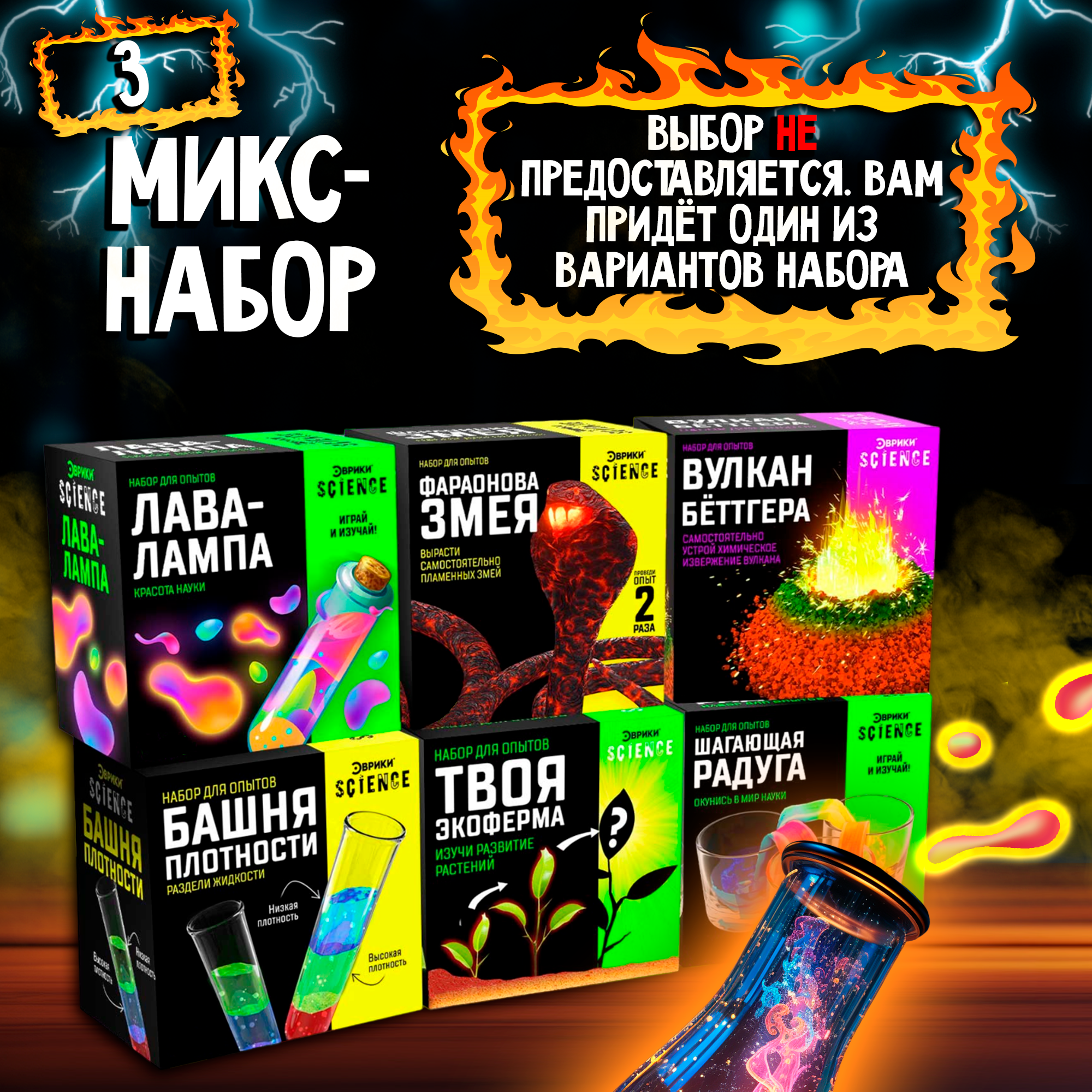 | Комплектация | Лава-лампа, Фараонова змея, вулкан Бёттгера, Коралловый риф, Шагающая лава, Коллоидный сад |