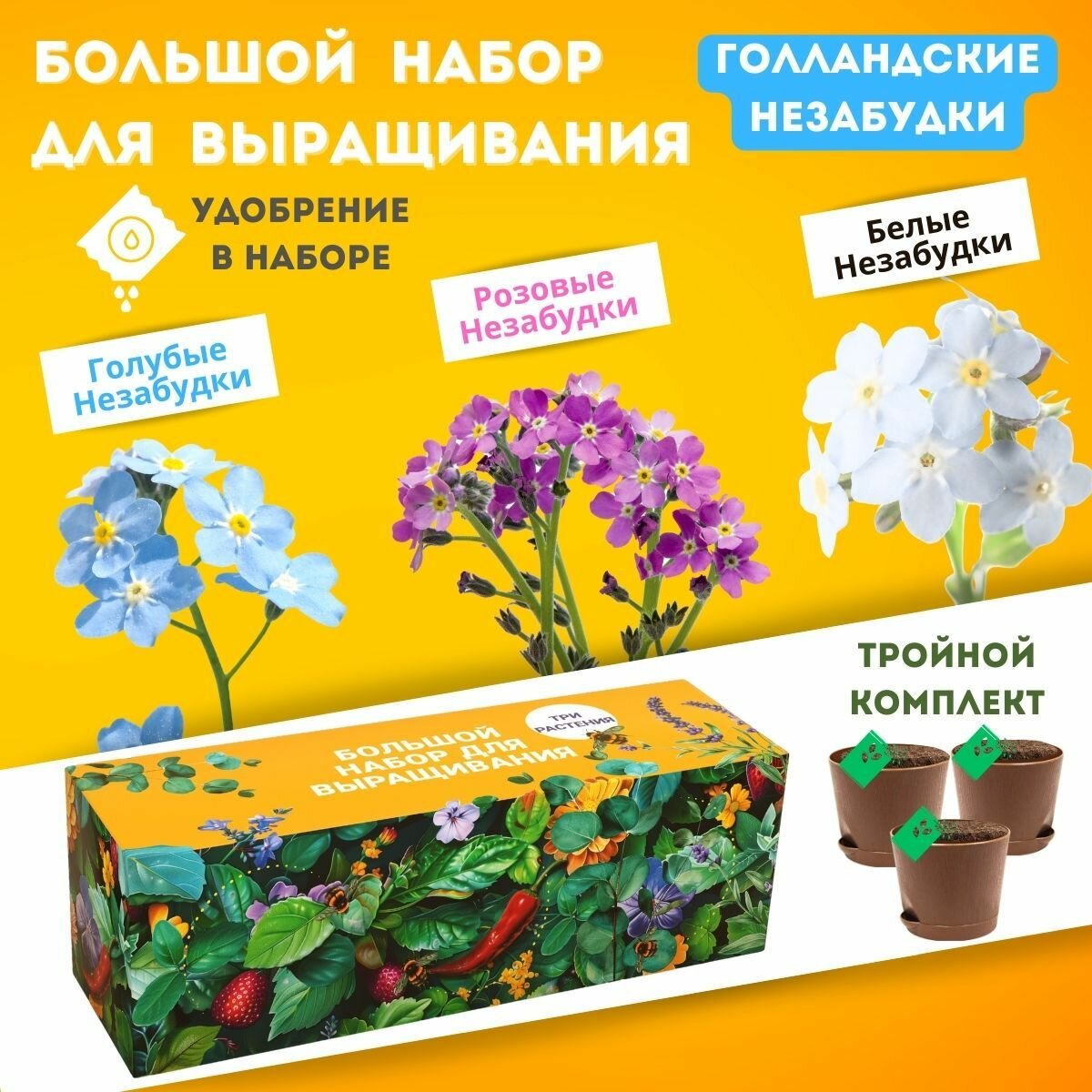 | Комплектация | Инструкция; горшочек объемом 0,4 л с системой прикорневого полива - 3 шт.; семена; грунт |