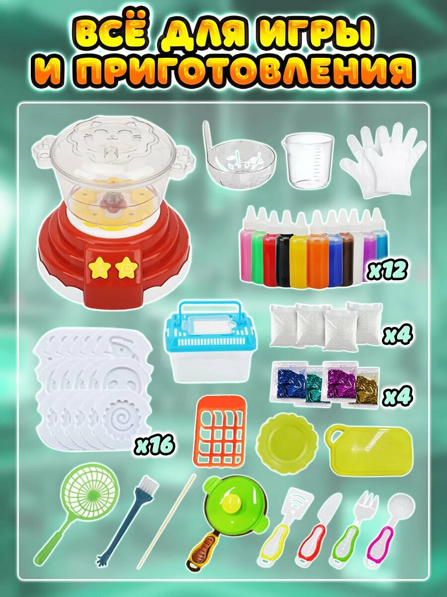 | Комплектация | Набор для изготовления слаймов - 1 шт (бокс-машинка для приготовления 3d-фигур - 1шт; аквагель (альгинат натрия) - 12шт; бокс -1шт; одноразовые перчатки - 1 пара; стержень для смешивания - 1шт; 3D-молд - 16шт; ложка с отверстиями - 1шт; лактат кальция - 4шт; кисть - 1шт; сачок - 1шт; мерный стакан - 1шт, блестки - 4шт; набор кухонных предметов - 8 шт) |