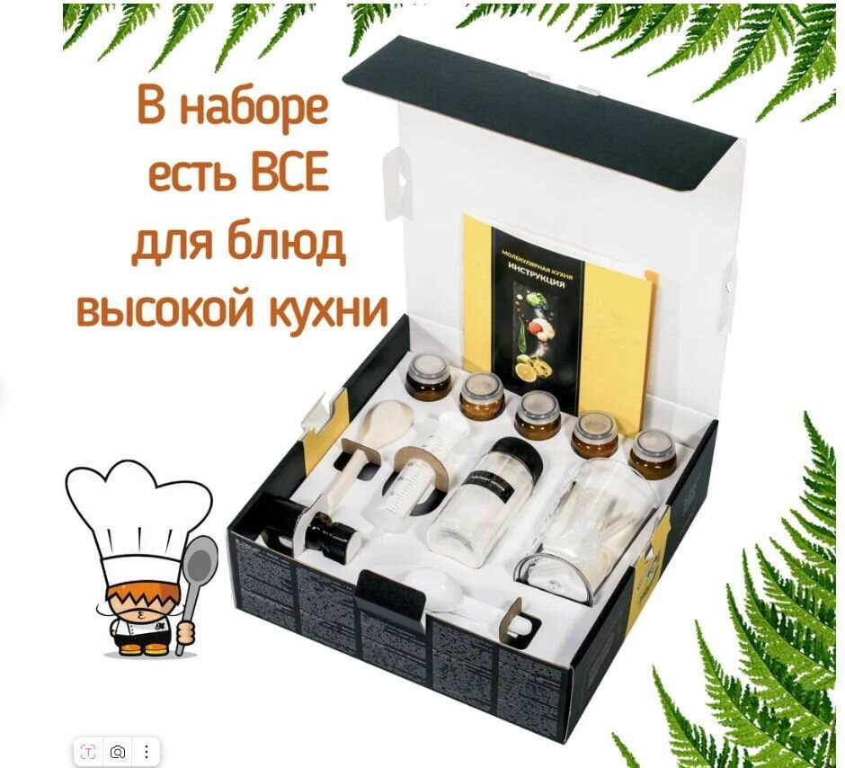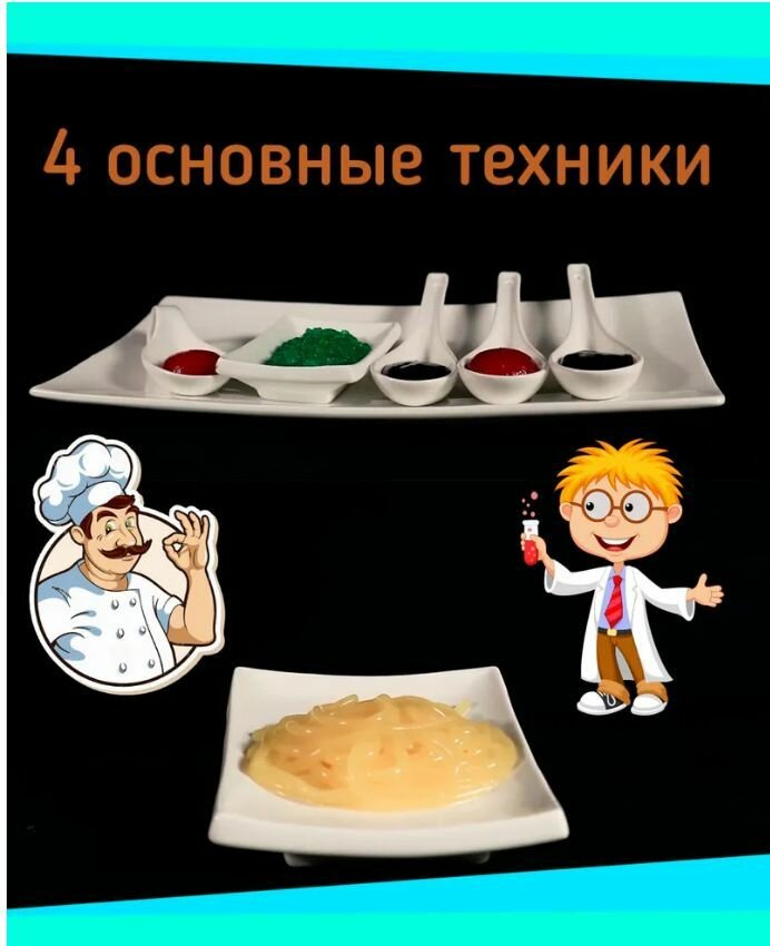 | Комплектация | хлорид кальция, лактат кальция, альгинат натрия, агар-агар, соевый лецитин, ксантановая камедь, пищевой краситель, пакет для льда, ложка для сервировки, мерный стакан, мерные ложки, силиконовая трубка, шприц (без иглы) |