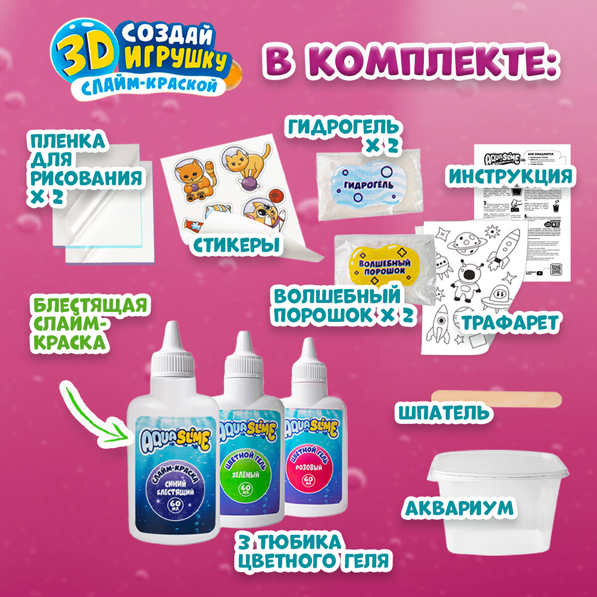 | Комплектация | гель краски для создания 3Д фигурок - 23; аквариум для хранения фигурок - 1 шт; волшебный порошок - 2 упаковки; гидрогель - 2 упаковки; трафареты для рисования - 3 шт; инструкция - 1 шт; стикеры для детей - 1 шт; пленка для рисования аквагель красками - 2 шт |