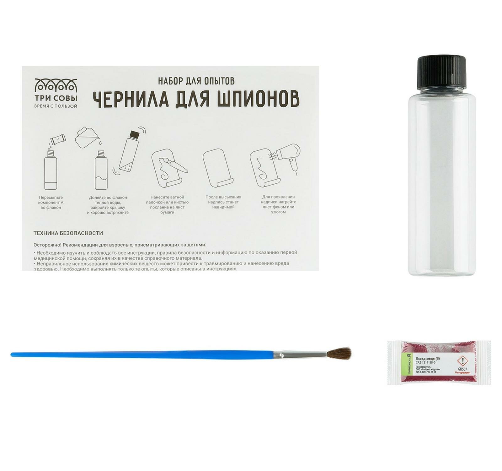 | Дополнительная информация | Набор для проведения опытов «Чернила для шпионов» — набор станет настоящим открытием для любознательных детей от 8 лет, позволит им самостоятельно провести первые научные эксперименты дома и узнать множество нового о химических и физических законах. |