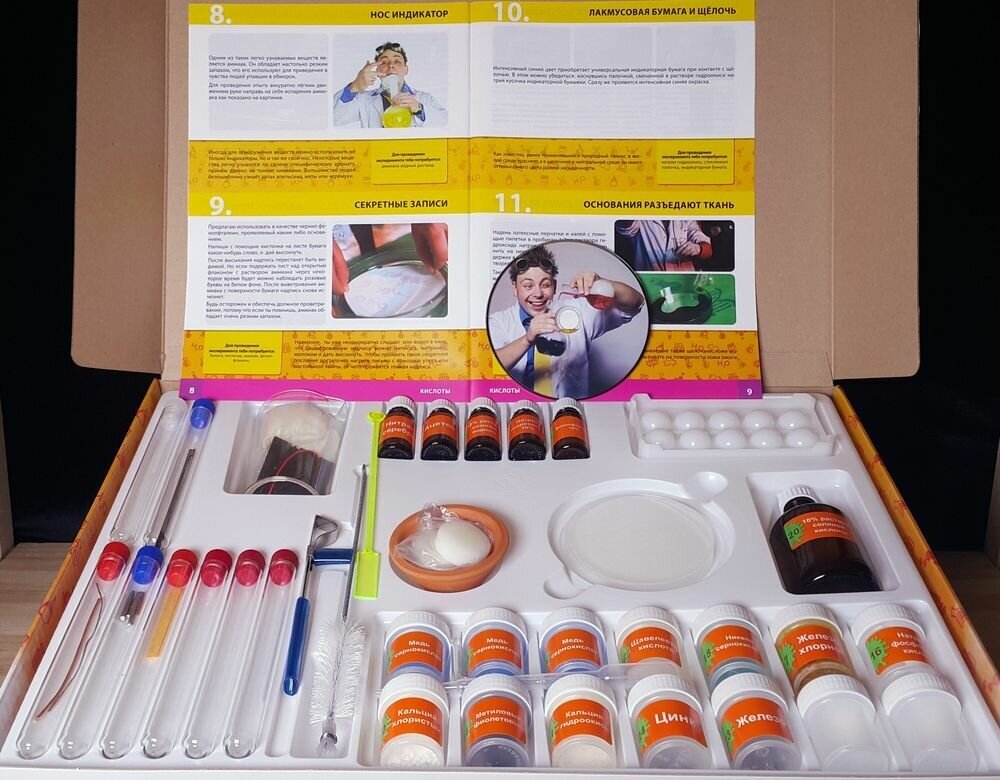 | Комплектация | Инструкция, чашка Петри, фильтровальная бумага, сухое горючее, подставка под пробирки (штатив), шпатель, светодиод, батарейный отсек, перчатки, ершик для пробирок, чашка для выпаривания, пробирки химические, пипетка Пастера, прямая стеклянная трубка, мерный стакан, Г-образная стеклянная трубка, щавелевая кислота, цинк, сульфат никеля, железо хлорное, 10% раствор фенолфталеина, медь сернокислая, индикаторная бумага лакмусовая нейтральная, аденозин нитрат, графитовые стержни, пробиркодержатель, ацетон, 10% раствор гидроксида натрия, 10% раствор аммиака водного, медь, алюминий, фосфат натрия, метиловый фиолетовый, 10% раствор соляной кислоты, кальций хлористый, железо, нихром, компакт-диск с видео. |
