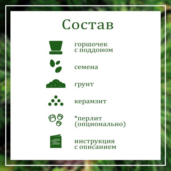 | Комплектация | пластиковый горшок, крышка-поддон для избытка влаги, семена кедра сибирского, плодородный грунт (PH=5.5-6.5), керамзит для дренажа |