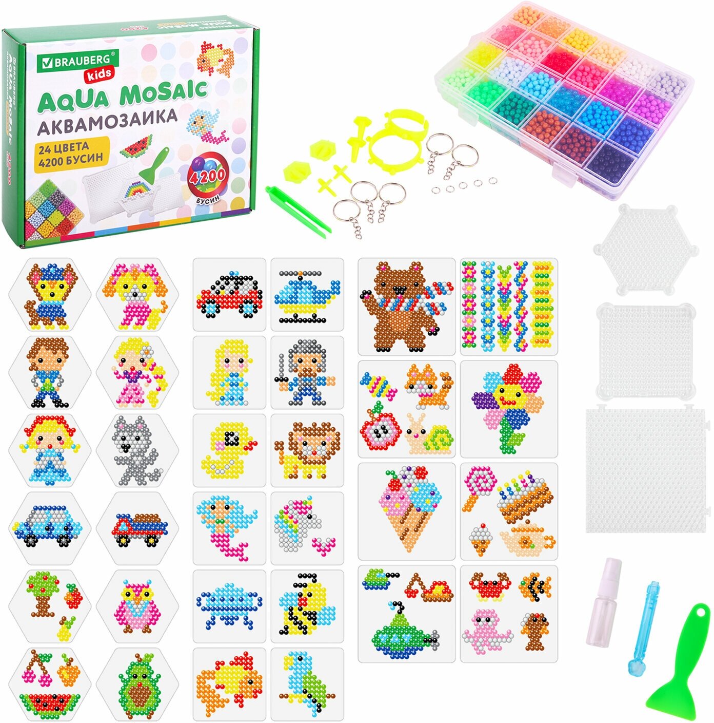 Купить Аквамозаика Aqua Pixels 24 цвета 4200 бусин, с трафаретами, инструментами и аксессуарами, Brauberg, 664916