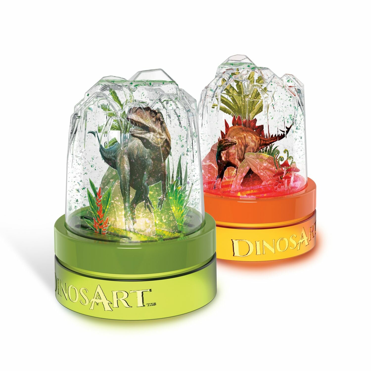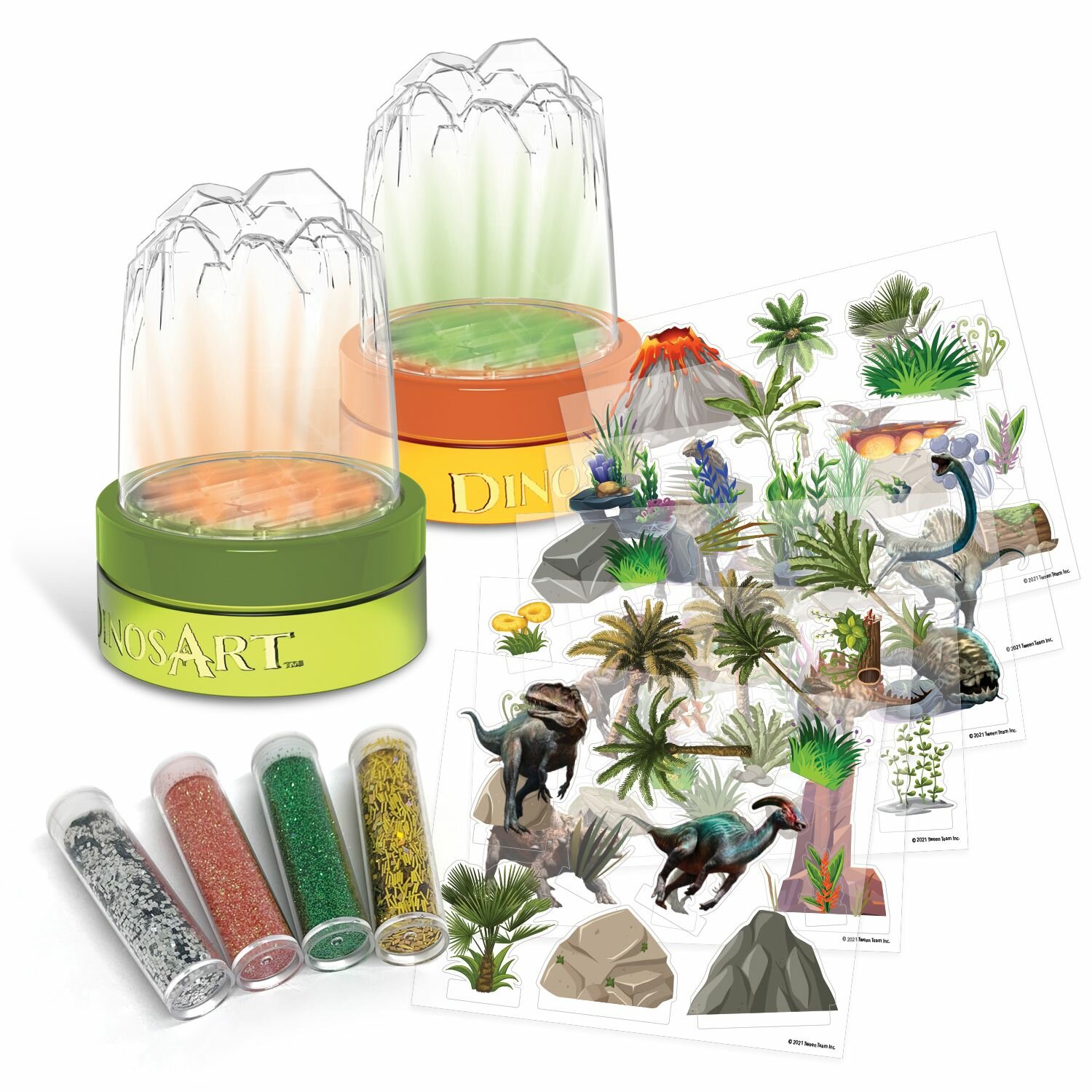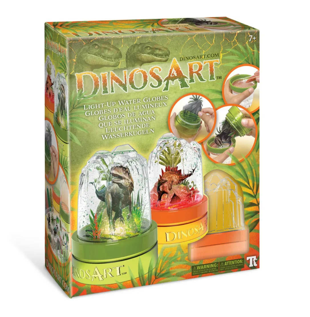 | Комплектация | 2 пластиковых аквариума с подсветкой, 61 деталь декорации, 2 тюбика с блестящей пудрой, 2 мини-тюбика с блёстками, коллекционная карточка с динозавром, инструкция |