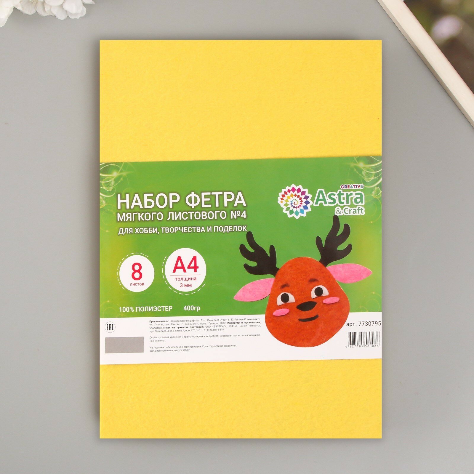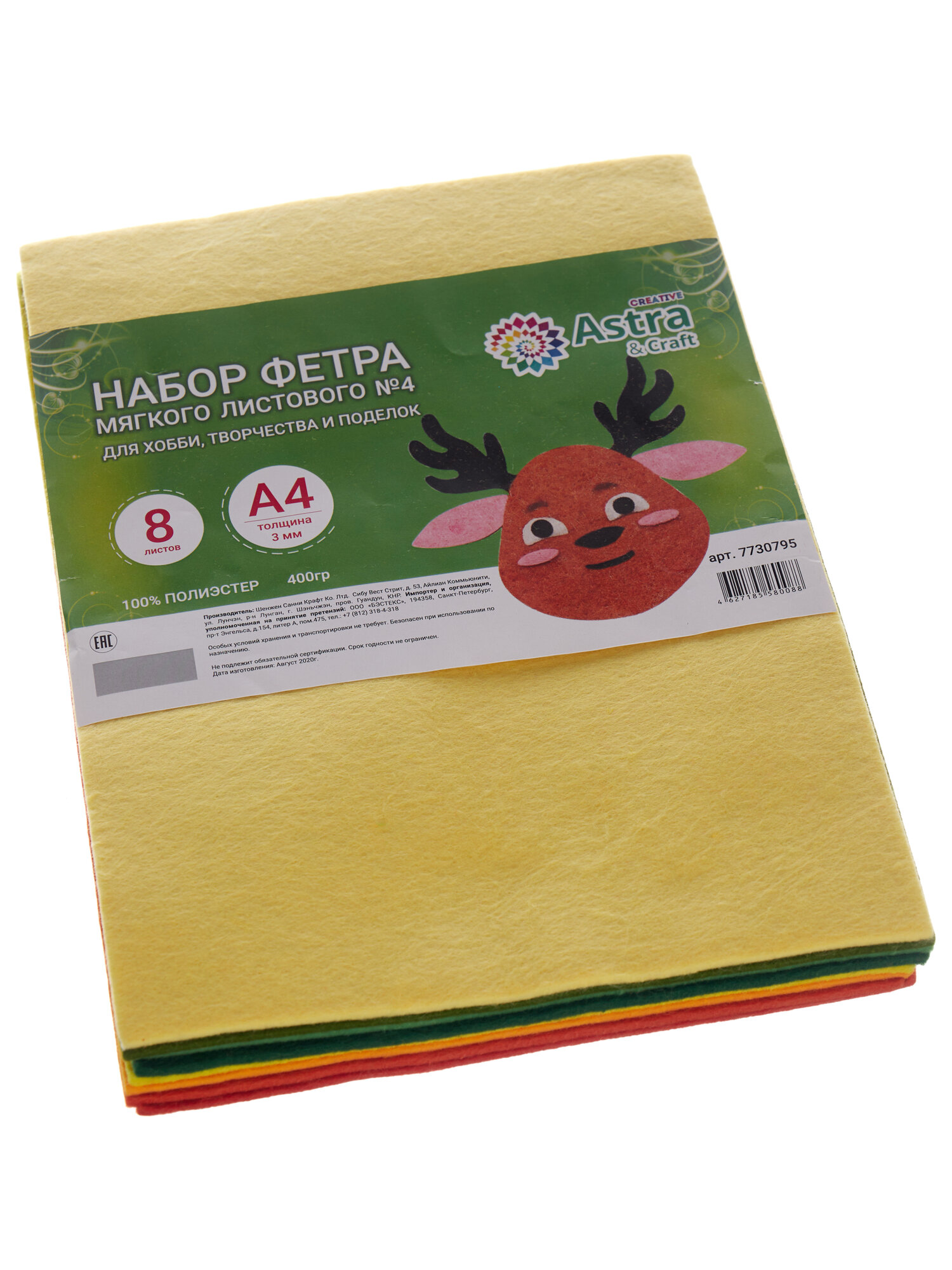 Набор мягкого фетра "Астра" (8 шт) ассорти, 3 мм, 400 гр. 20х30 см 10368912