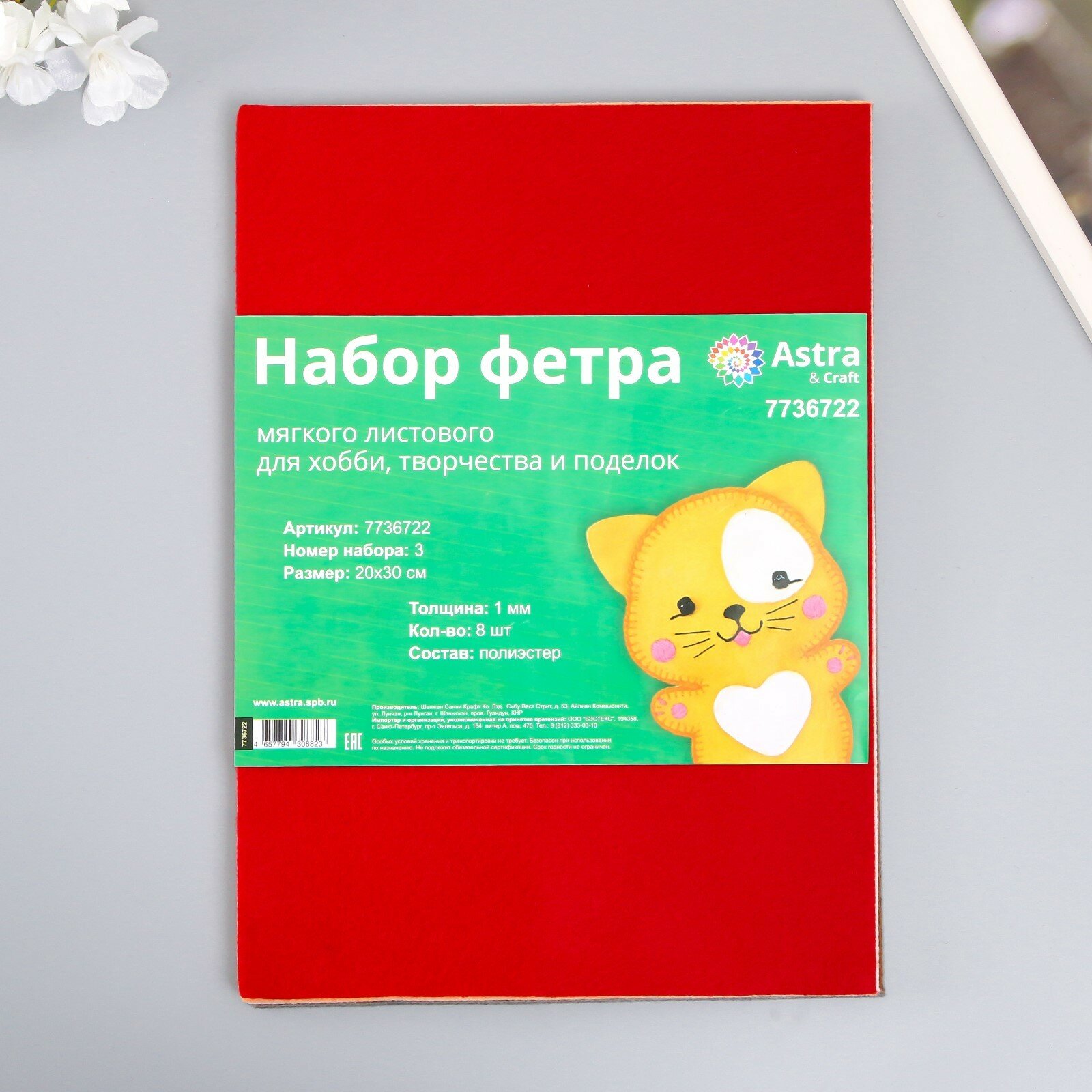 Набор мягкого фетра "Астра" (8 шт) ассорти, 1 мм, 170 гр. 20х30 см 10368895