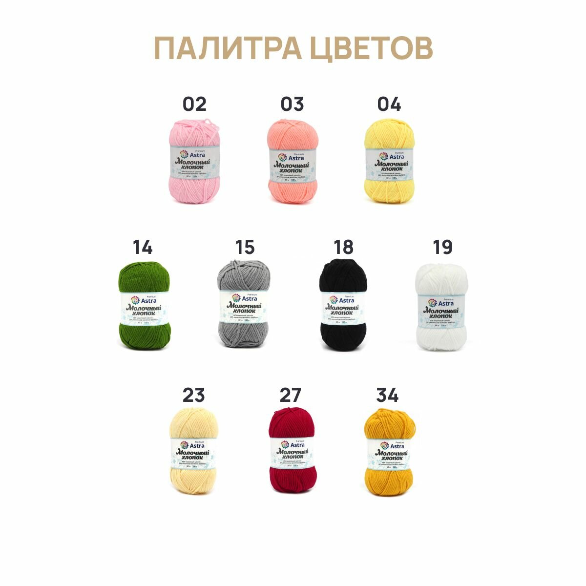| Комплектация | Упаковка 3 штук Пряжа Astra Premium 'Молочный хлопок' (Milk Cotton) 50гр 100м (+/-5%) (50%хлопок, 50%молочный акрил) (34 горчичный) |