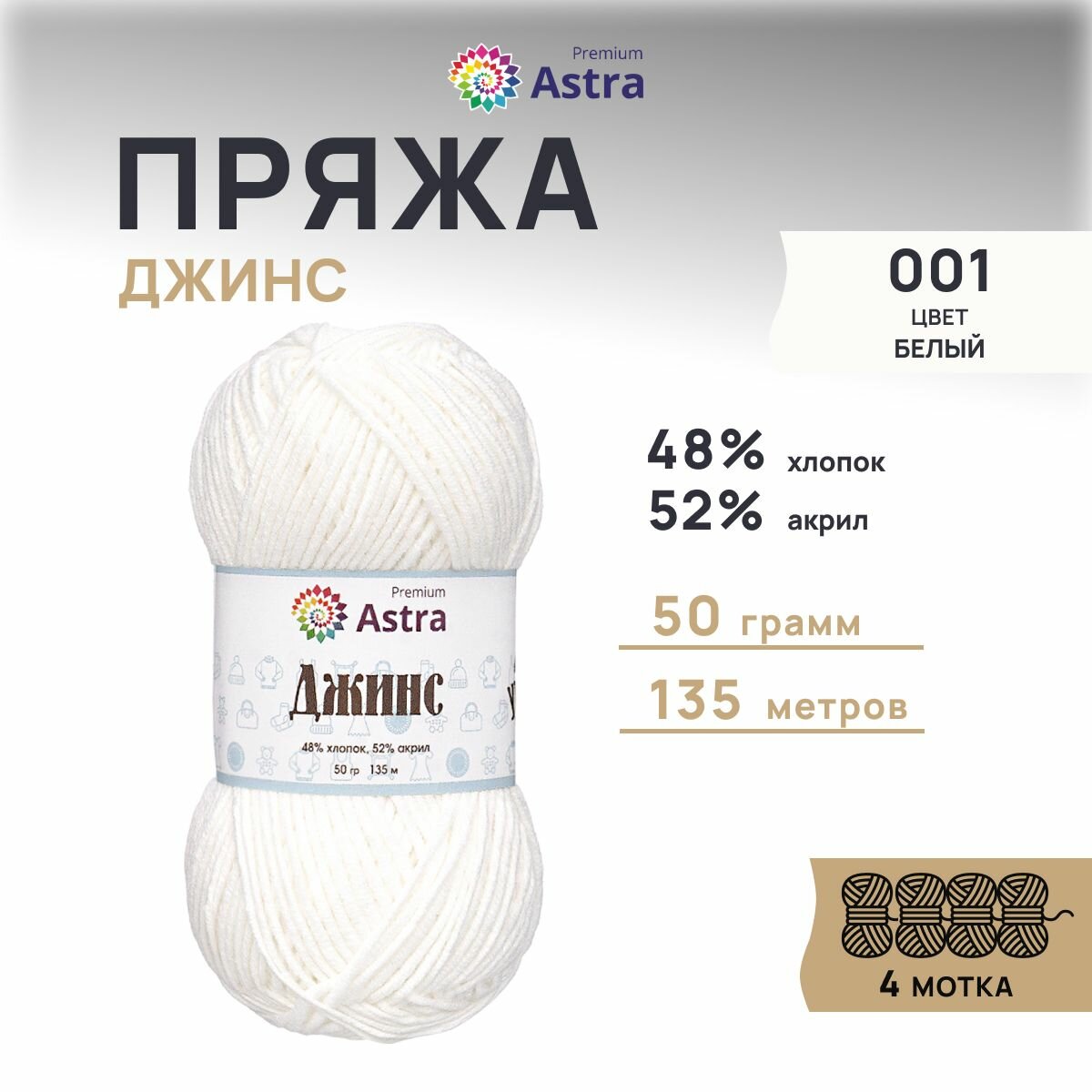 Купить Пряжа для вязания Astra Premium 'Джинс' (Jeans), 50г, 135м (48% хлопок, 52% акрил) (001 белый), 4 мотка