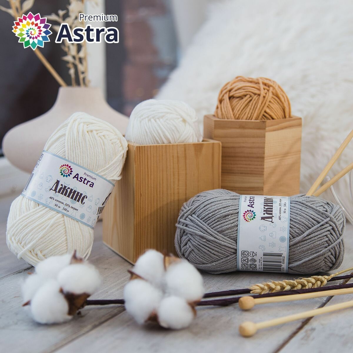 Пряжа Astra Premium "Джинс", 50 гр 135 м, 48% хлопок, 52% акрил, 020 молочный, 4 шт