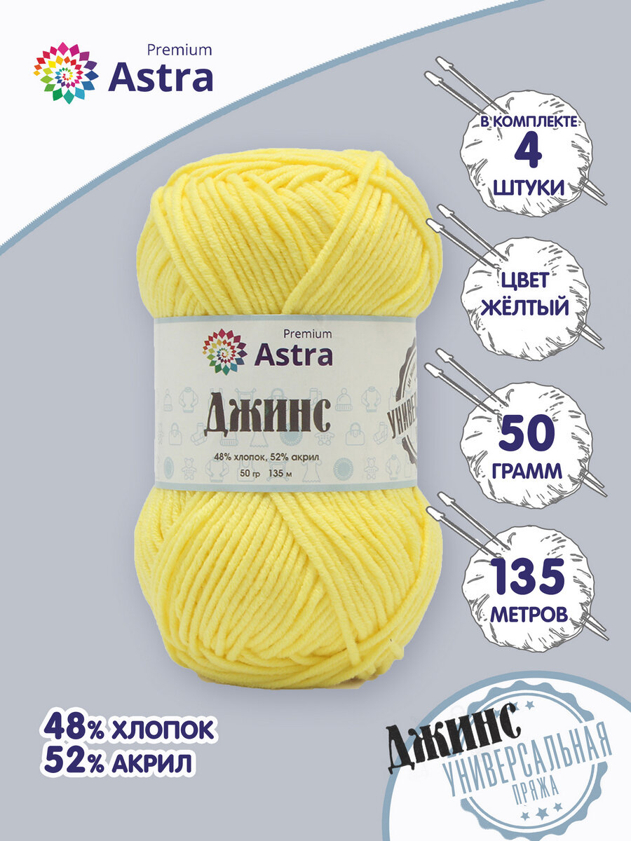 Купить Пряжа Astra Premium "Джинс", 50 гр 135 м, 48% хлопок, 52% акрил, 310 желтый, 4 шт