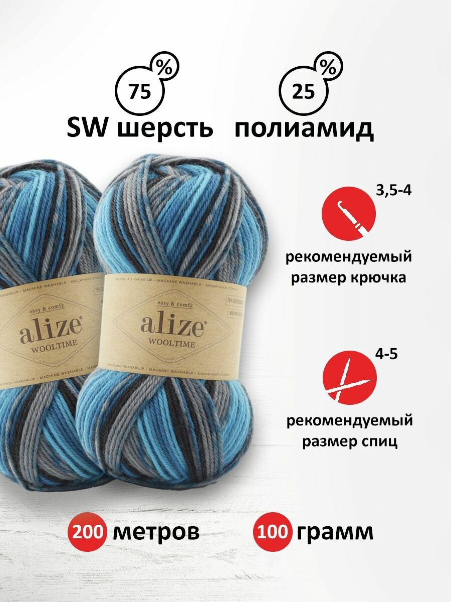 Пряжа Wooltime, Alize, принт - 11018, 75% SW шерсть, 25% полиамид, 5 мотков, 100 г., 200 м.