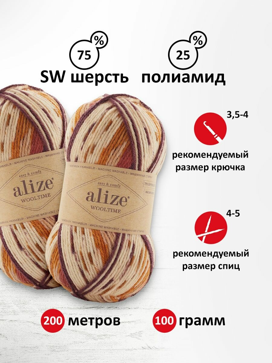 Пряжа Wooltime, Alize, принт - 11018, 75% SW шерсть, 25% полиамид, 5 мотков, 100 г., 200 м.