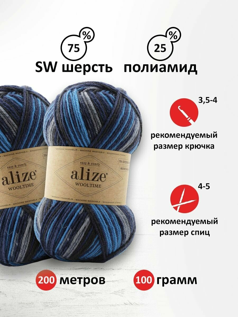 Пряжа Alize Wooltime принт черный-серый-синий (11011), 75%шерсть/25%полиамид, 200м, 100г, 2шт