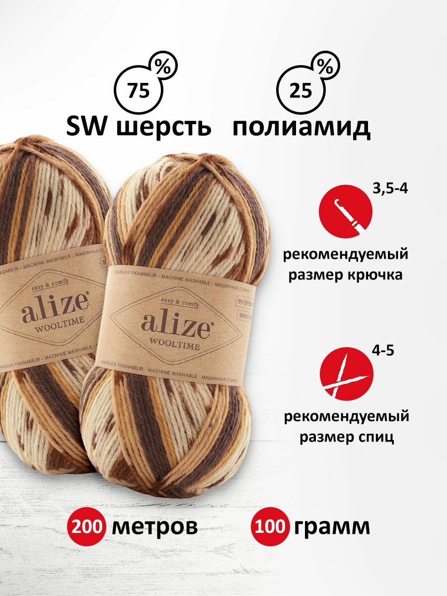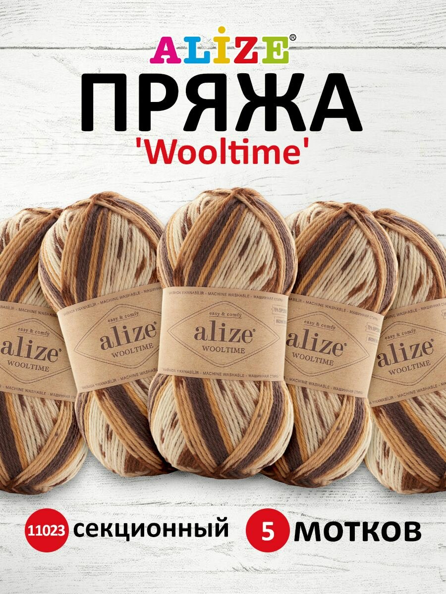 Пряжа Wooltime, Alize, бел/беж/корич - 11023, 75% SW шерсть, 25% полиамид, 5 мотков, 100 г., 200 м.