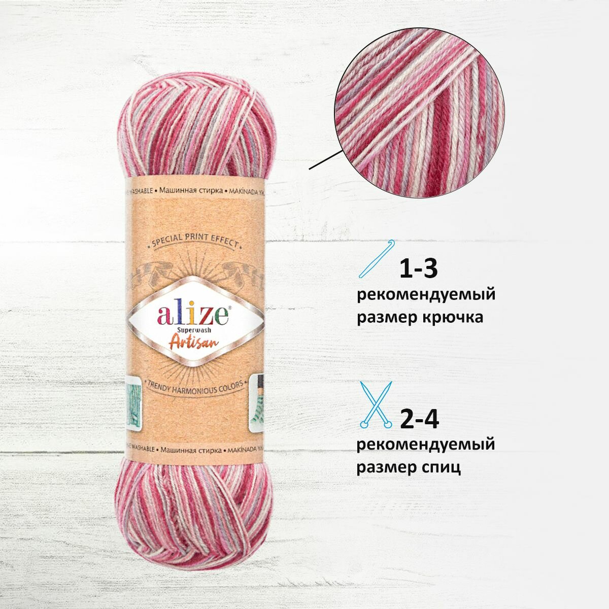 Пряжа SUPERWASH ARTISAN ALIZE, малиновый принт - 9002, 75% SW шерсть, 25% полиамид, 5 мотков, 100 г, 420 м.