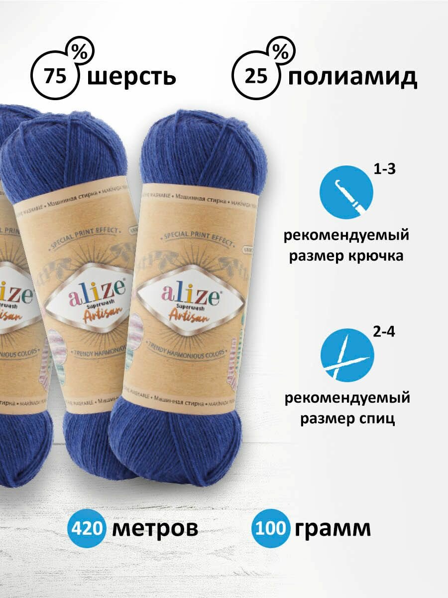 Пряжа Alize Superwash Artisan (Ализе Супервош Артизан) - 3 мотка, Темно-синий (797), 75% шерсть супервош, 25% полиамид, 420м/100г