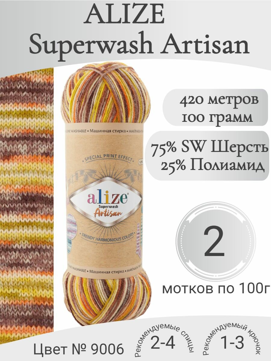Пряжа Alize Superwash Artisan (Ализе Супервош Артизан) - 2 мотка, Коричневый, оранжевый, зеленый (9006), 75% шерсть супервош, 25% полиамид, 420м/100г