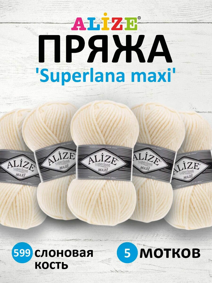 Пряжа ALIZE Superlana maxi Ализе Суперлана Полушерсть: 599 (слоновая кость), 5 шт 100 м 100 г, 25% шерсть , 75% акрил