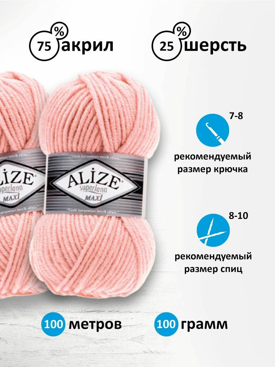 Пряжа ALIZE SUPERLANA MAXI, пудра - 161, 25% шерсть, 75% акрил, 5 мотков, 100 г, 100 м.