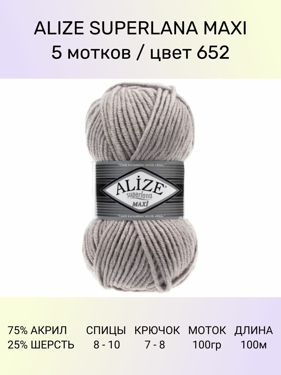 Купить Пряжа для вязания ALIZE 'Superlana maxi', 100г, 100м (75% акрил, 25% шерсть), ТУ (652 пепельный), 5 мотков