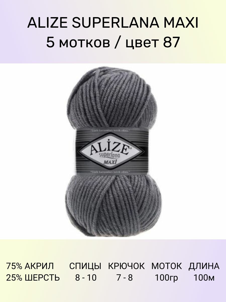 Пряжа Alize Superlana Maxi угольный серый (87), 25%шерсть/75%акрил, 100м, 100г, 1шт
