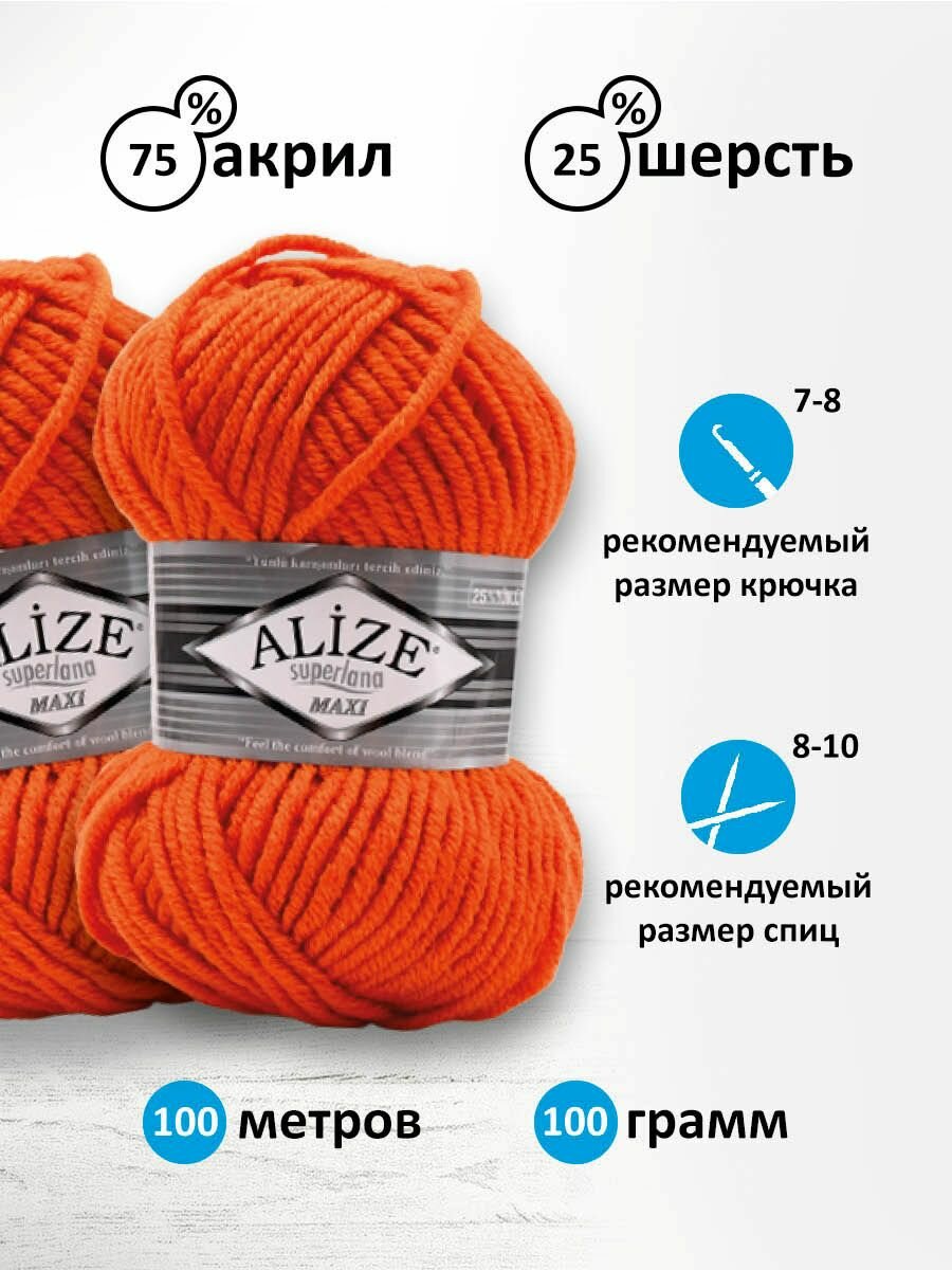 Пряжа ALIZE SUPERLANA MAXI, оранж - 225, 25% шерсть, 75% акрил, 5 мотков, 100 г, 100 м.