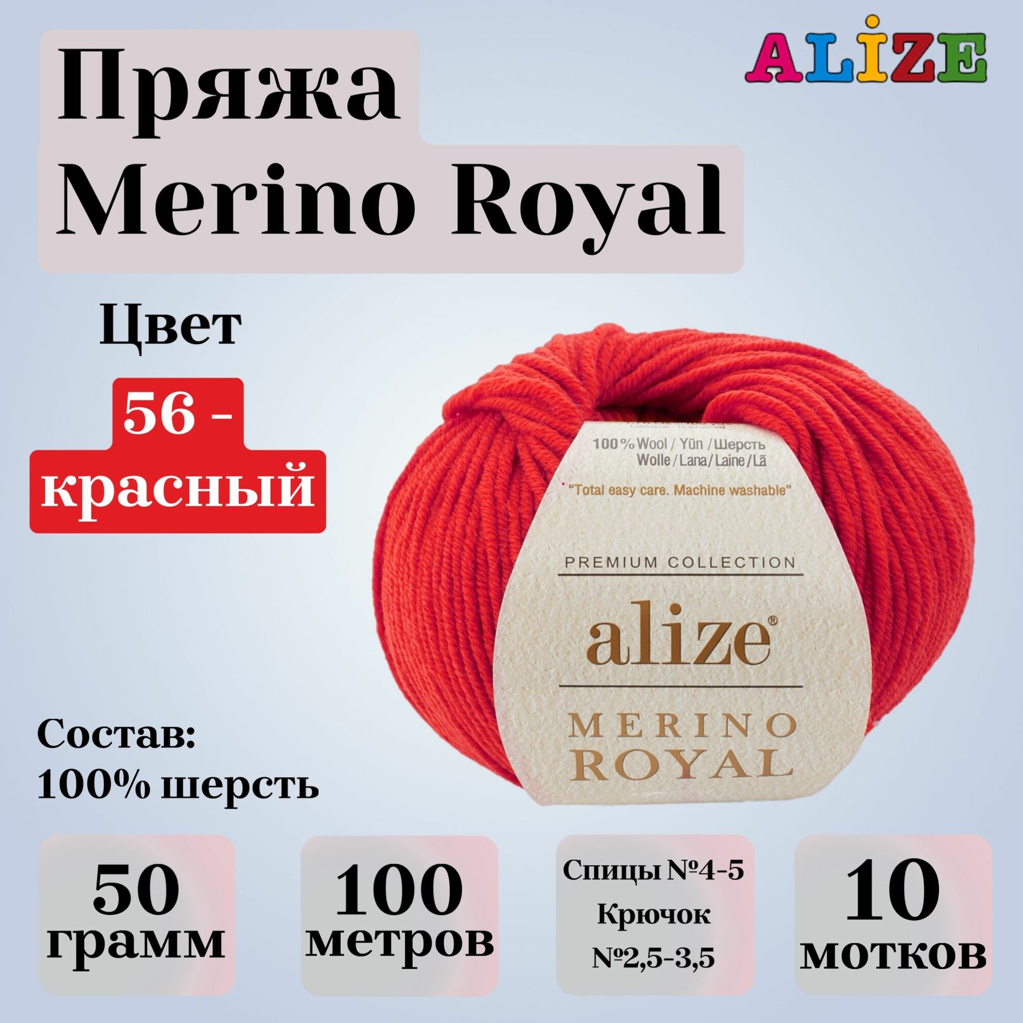 Пряжа для вязания ALIZE 'Merino Royal', 50г, 100м (100% шерсть) (56 красный) 10 мотков