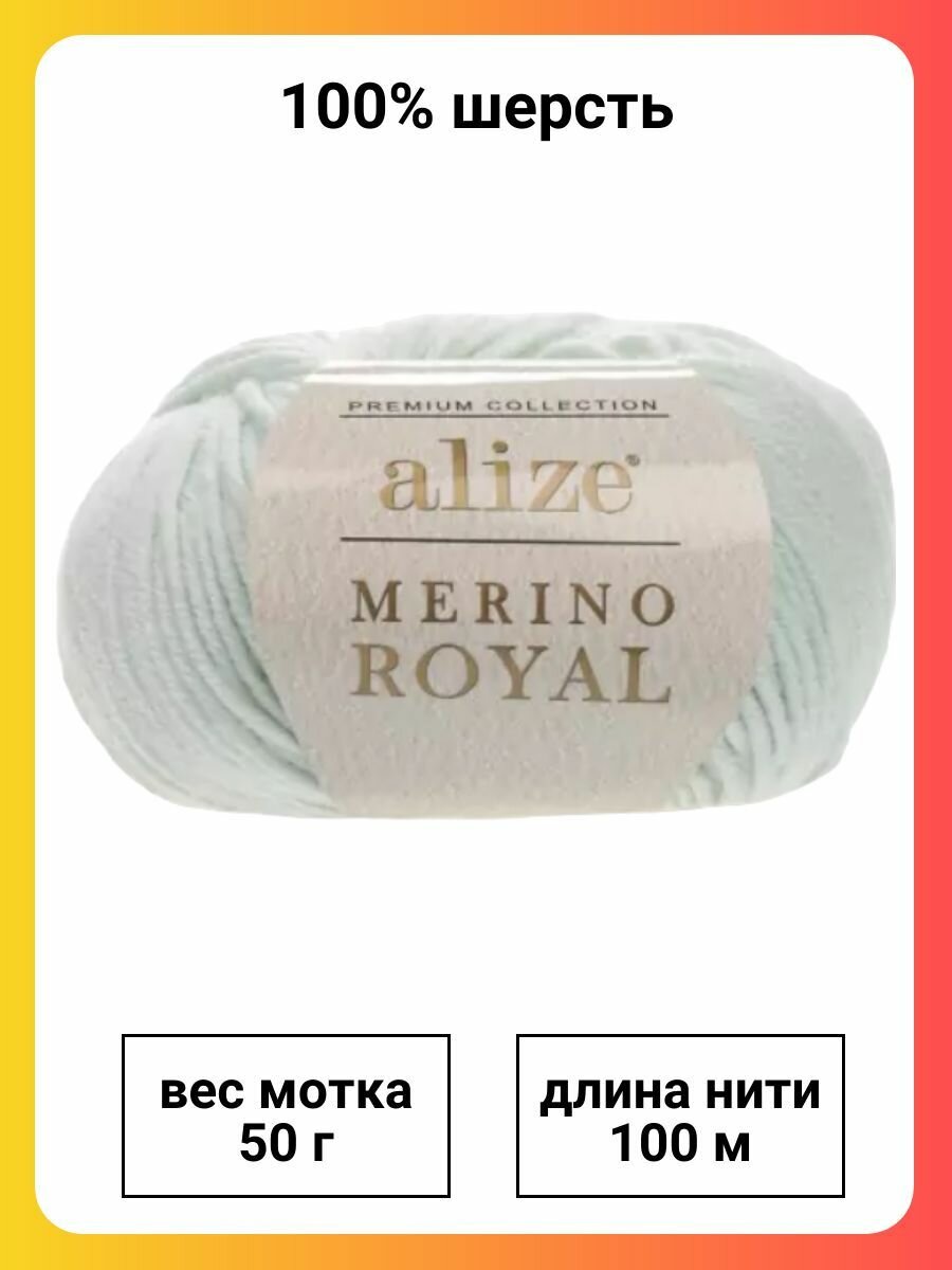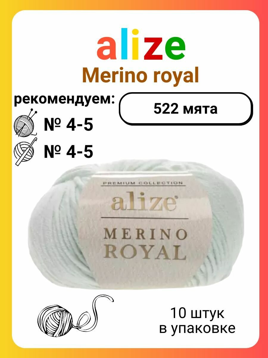 Пряжа Alize Merino Royal - 1 шт, 522 мята, 100 м/50 г, 100% мериносовая шерсть /Ализе мерино роял/